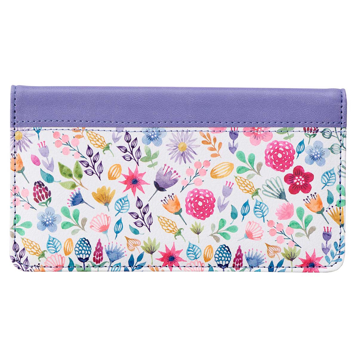 The Faux Leather Checkbook Cover is made of supple and scuff-resistant faux leather in two vivid tones: a happy turquoise and a bright floral-patterned white, stitched together at the spine with durable turquoise thread. The cover is smattered with fun watercolored flowers in an array of lively hues, emphasizing the swooping calligraphy of the Bible verse at the cover’s center. The verse is foiled in shining lavender.