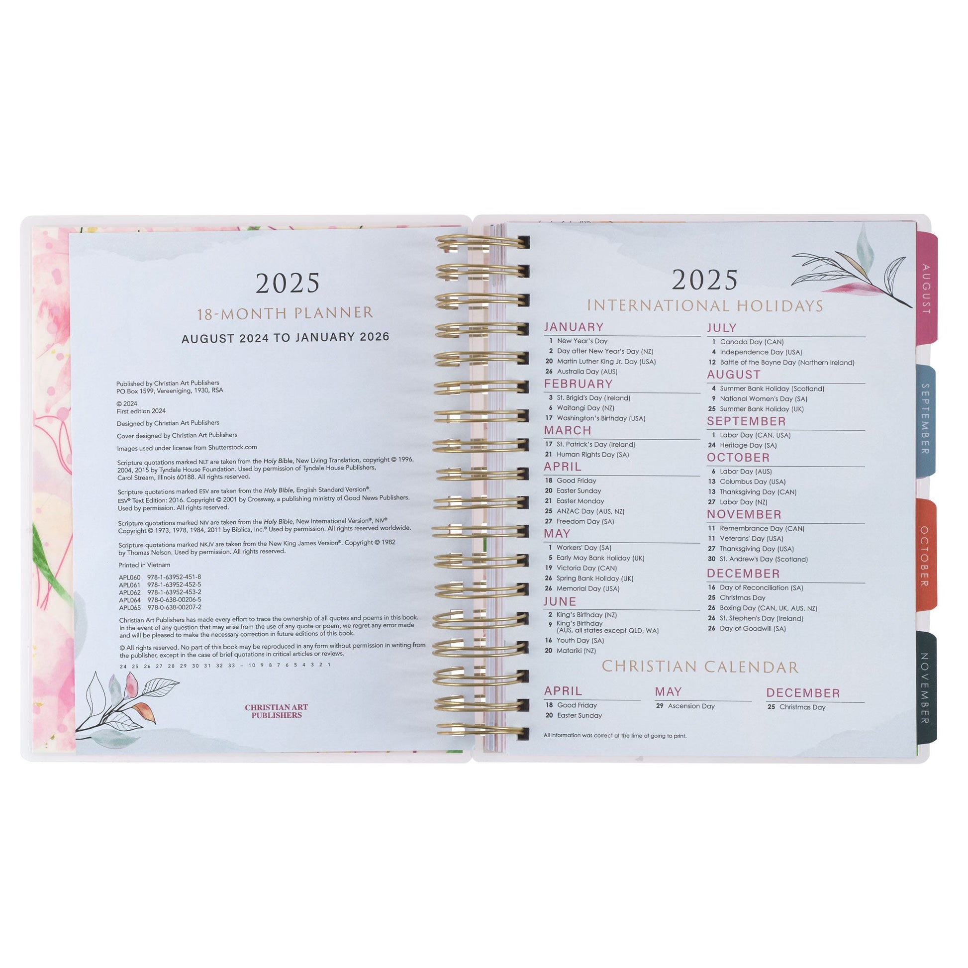 The planner provides ample room for notes, daily goals, to-do lists, appointments, and upcoming events. Multicolor inspirational quotes and Scripture on each page will brighten any day, and colorful monthly tabs make locating an exact date easy.