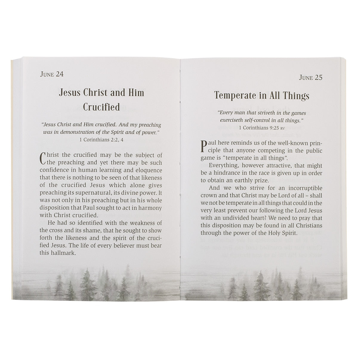 Each daily reading includes a day and date that follows a calendar year, title, and Scripture verse followed by devotional thought. Themes include the supremacy of Christ, intercessors, desire, adoration, obedience, love, humility, temperance, prayer, and much more.