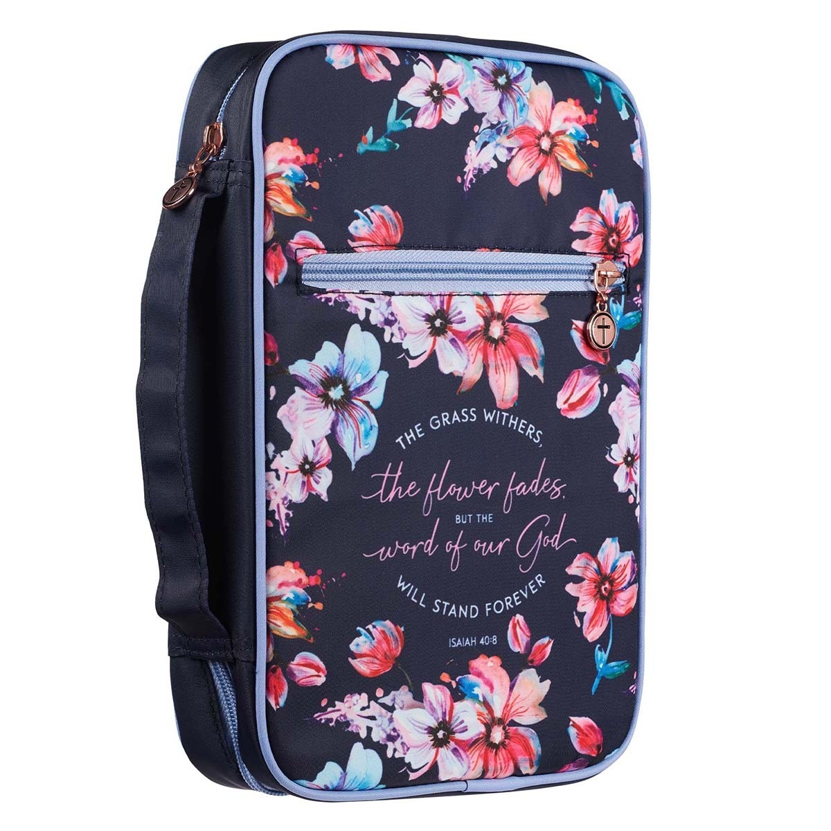Two small zippered pockets appear on the front and back panels and can be used to store small items such as Kleenex, a small notebook, or papers. The gold metal zipper pulls have round medallions engraved with a cross. An attached lay-flat spine handle, constructed from the same silky smooth navy nylon, allows the Bible cover to open fully when in use. On the inside of the Bible case are two pen loops to keep a pen or highlighter handy. This Bible cover is available in two sizes: medium and large. Please refer to the last image in the image carousel on the left for the Bible Cover Sizing Chart before selecting a size. The God's Word Stands Forever Navy Floral Nylon Fashion Bible Cover's message and design make it an appropriate gift for a mother, grandmother, Bible study leader, or friend. Use it as a gift of appreciation when you give it to a Bible study leader or as a gift of love and encouragement when you give it to your mom on Mother's Day. The God's Word Stands Forever Navy Floral Nylon Fashion Bible Cover will make Christmas extra special for a friend who needs some encouragement.- Full-color Floral Design