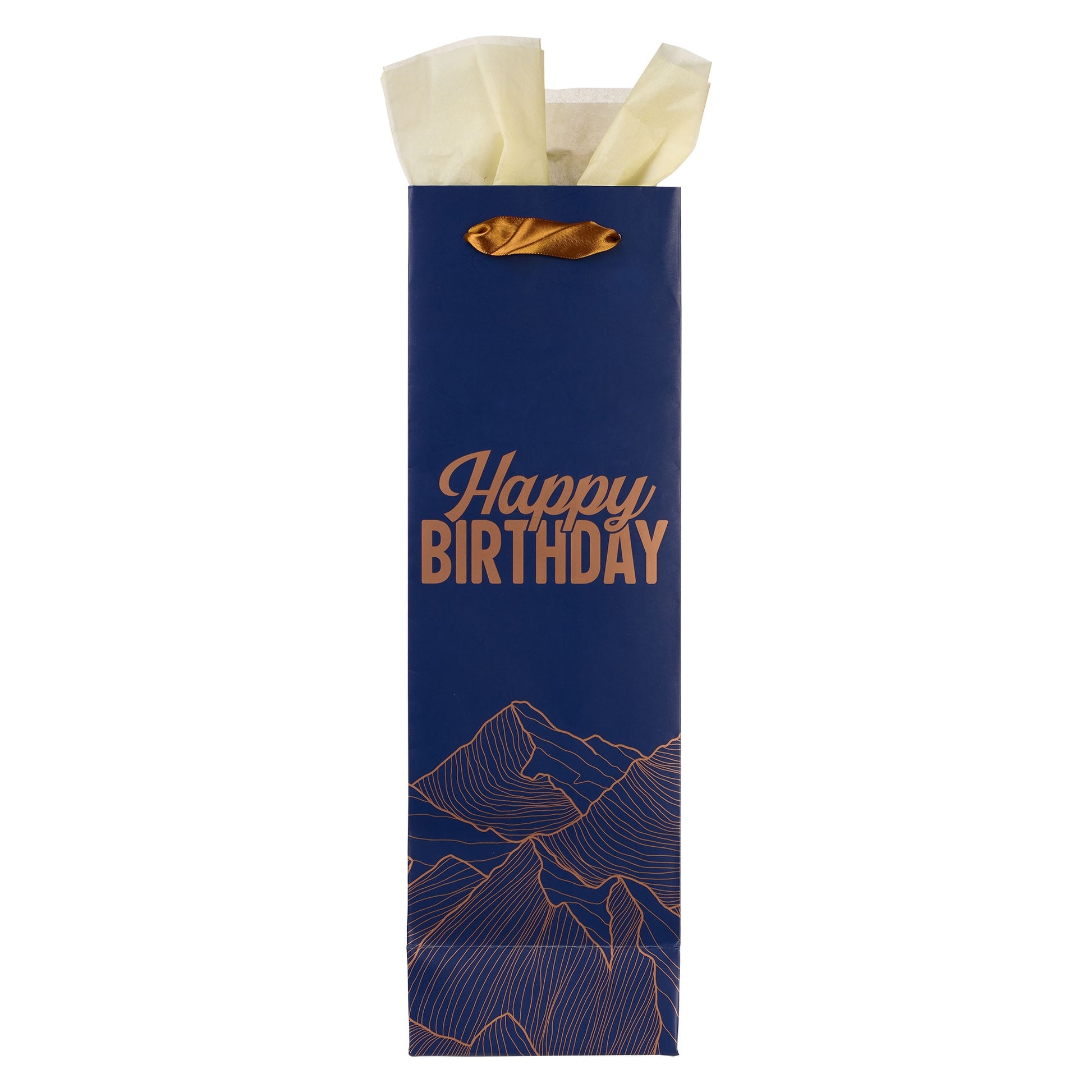 The blue background of the bottle gift bag stretches across all four of its panels. At the base is a bronze-foiled line-drawn mountain peak design with a setting sun. The sentiment sits atop the mountain design and is presented in bold bronze-foiled letters.