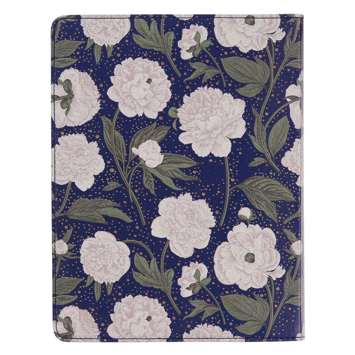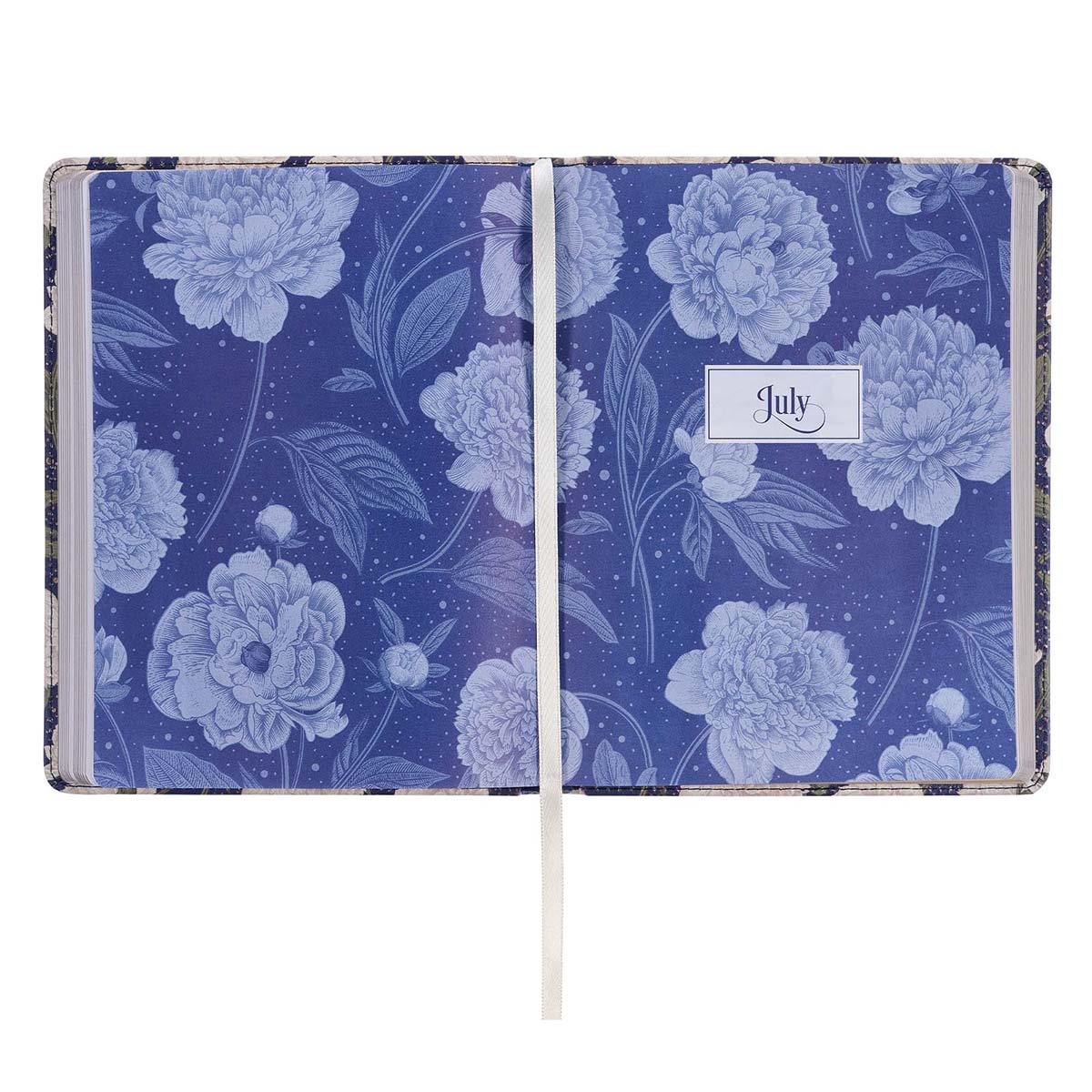 The navy blue faux leather cover of the 365-day devotional is scattered with white peonies with their elegantly curved stems suspended in a universe of gold-foiled dots. The sprinkling of golden dots are complimented by gilt-edged page edges. The title and subtitle are captured in a cream-colored frame with a navy border and lettering.
