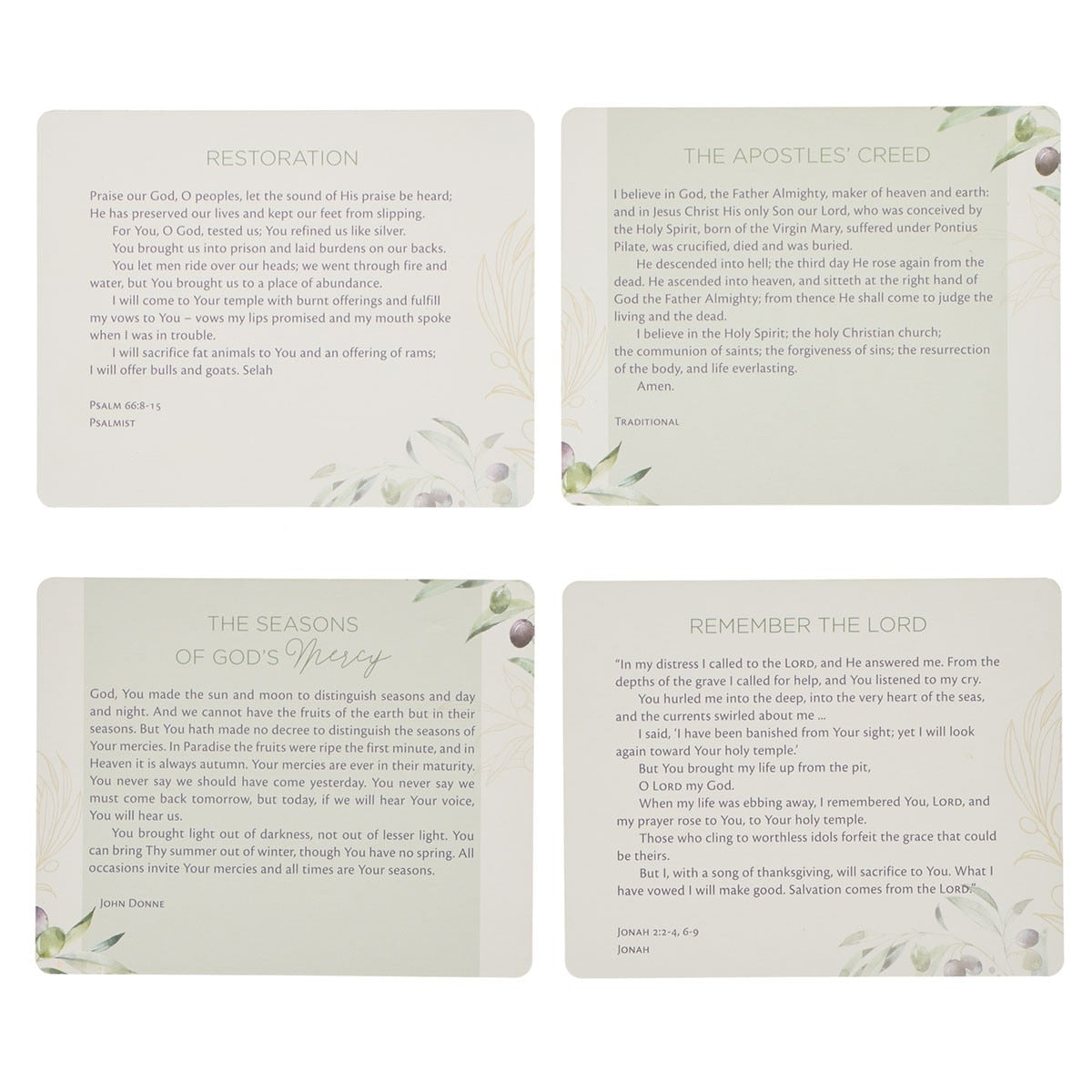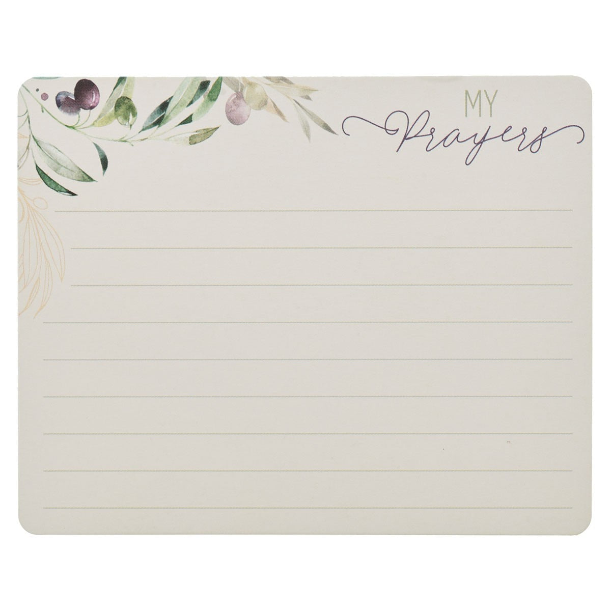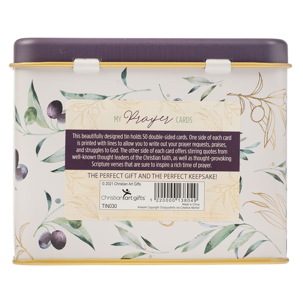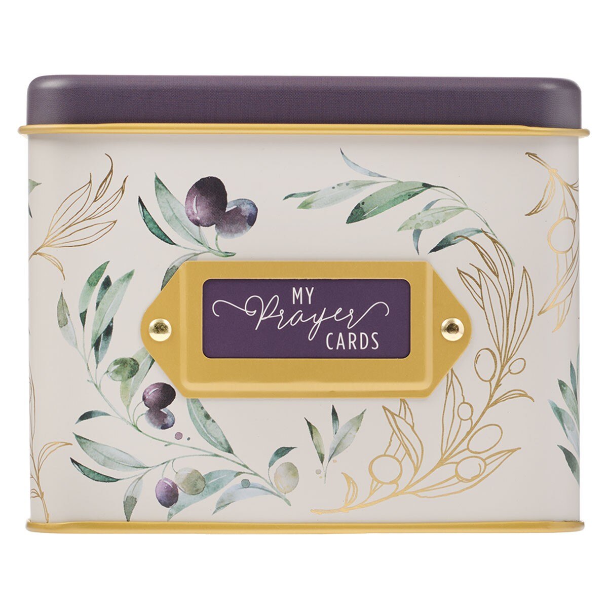 Inside the tin are 50 double-sided cards. Each card's front is decorated with the same olive branch design and holds well-known prayers from the Bible. The back of each card is lined with space for you to craft your own prayer.
