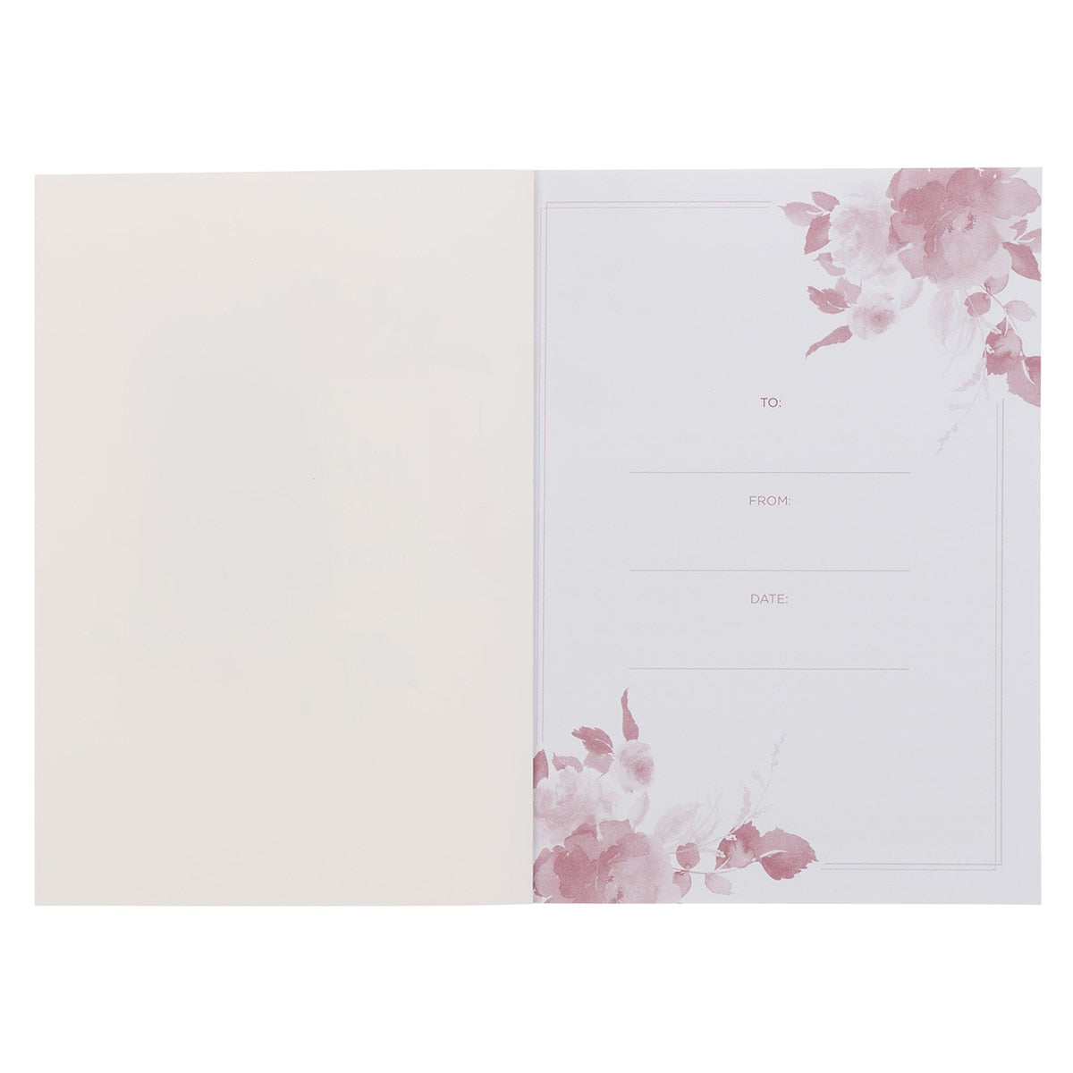 The creamy white cover features a white frame with a pink-foiled border. Beautiful red, yellow, and pink watercolor flowers accent the frame, which holds the sentiment, displayed in pink-foiled and red letters.