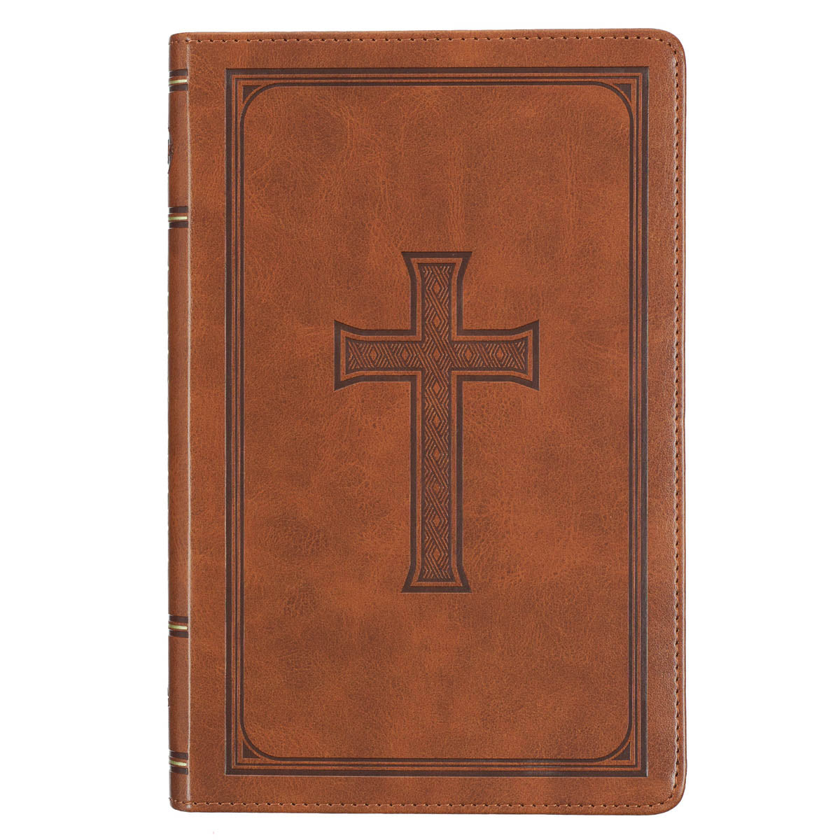 This Bible's rich honey-brown faux leather cover features a handsome heat-debossed design, showcasing a gracefully understated Celtic cross encased within a heat-debossed frame to create a reverent feel. The title is heat-debossed on the spine and flanked by two heat-debossed faux spine ribs.