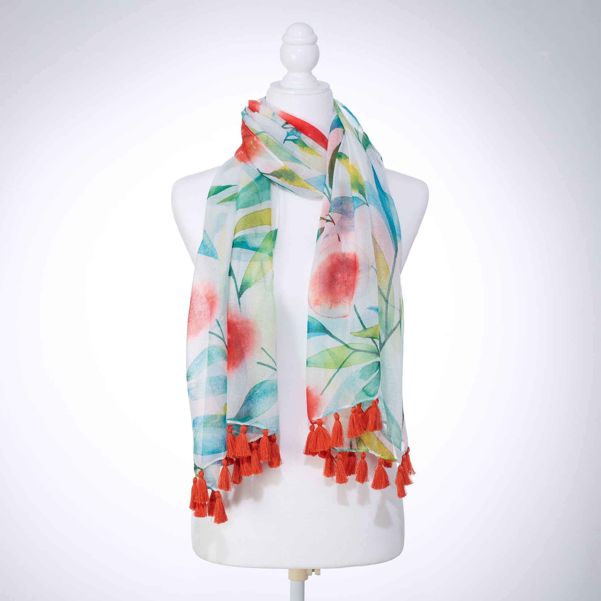 Delicate, vibrant orange blossoms in watercolored hues of teals, greens, and corals dance across the scarf's design. Rich orange tassels add a finishing touch and vibrant pops of color. This sheer, lightweight scarf comes nestled in a light teal gift box with a full-color printed interior that matches the scarf's design. A rose gold-gilded message is displayed across the box's lid.