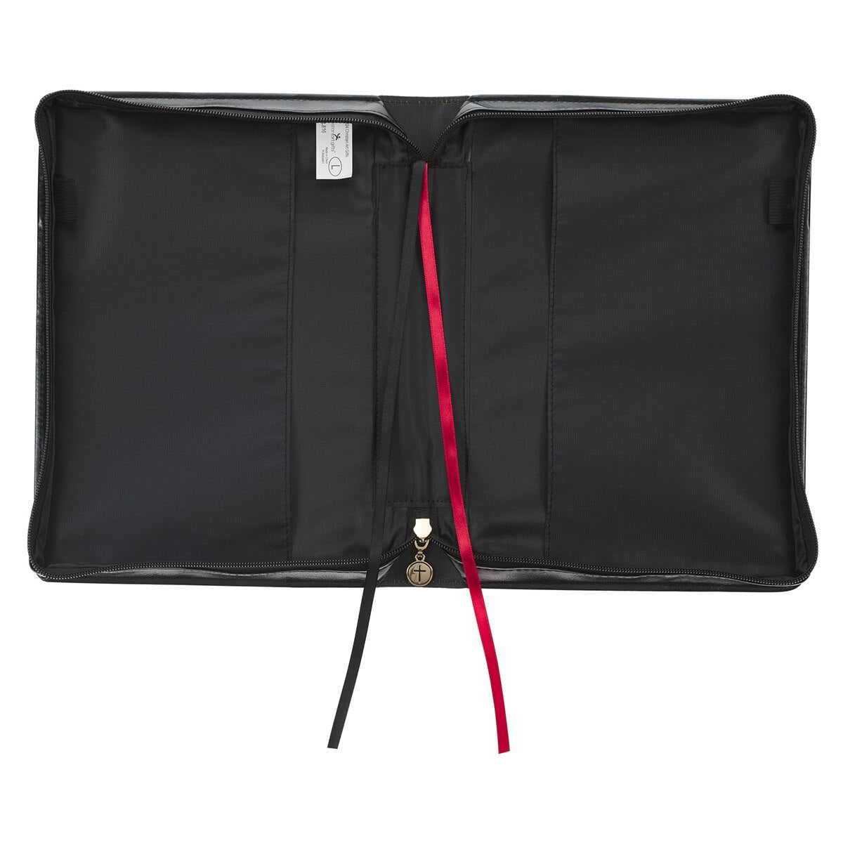 The back panel features a convenient slip pocket, perfect for stashing loose notes. A sleek black zipper, complemented by a round gold metal zipper pull engraved with a cross, securely closes the covers. Matching gold metal handle hardware attaches a lay-flat spine handle. This design ensures the handle folds neatly out of the way, preventing damage to your Bible when you open the case.