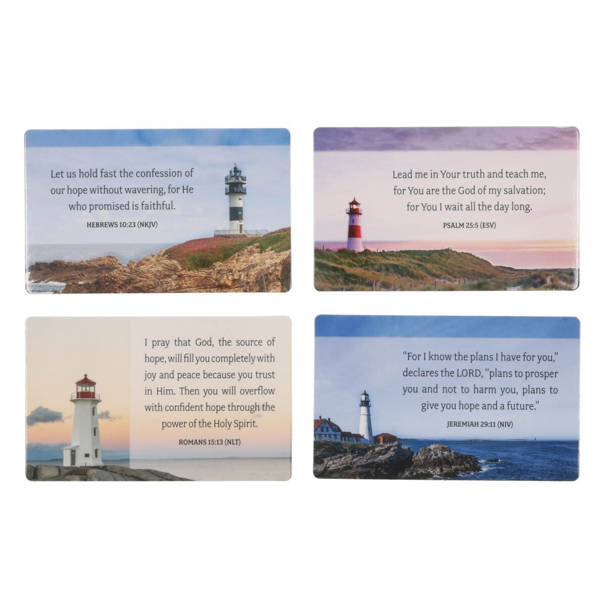 Each card in the pack is adorned with a captivating image of a lighthouse, an enduring symbol of hope that shines brightly in the darkness. The flip-open card pouch features a stunning portrait of a lighthouse standing firm on a rocky shore. The title is displayed in bold blue uppercase letters.