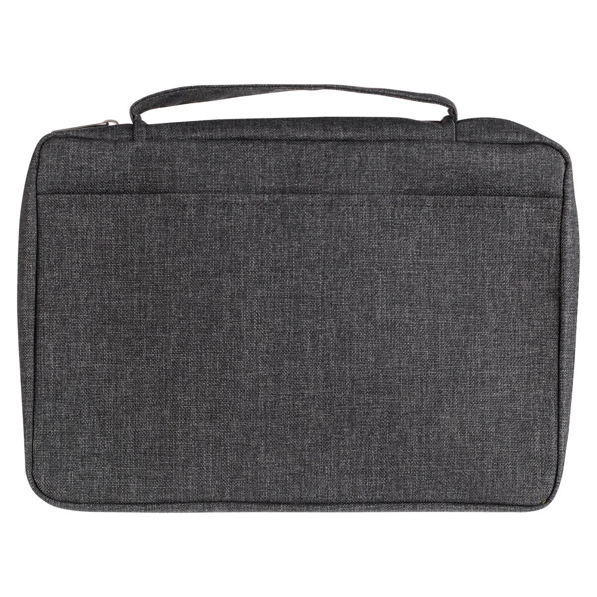 A silver cross-engraved zipper pull attached to a sturdy zipper securely closes the Bible case, and a lay-flat handle constructed from the same material as the Bible case folds neatly away so that the Bible can open flat. A slip pocket on the back is handy for storing notes and church bulletins, and two interior pen loops keep a pen and pencil or highlighter at the ready.