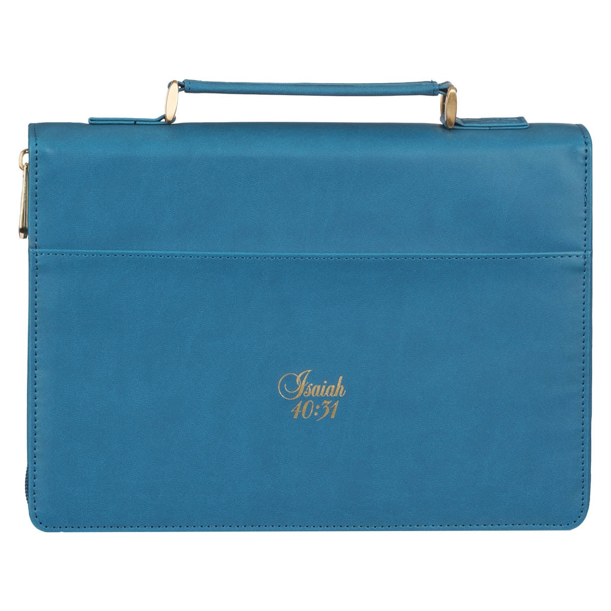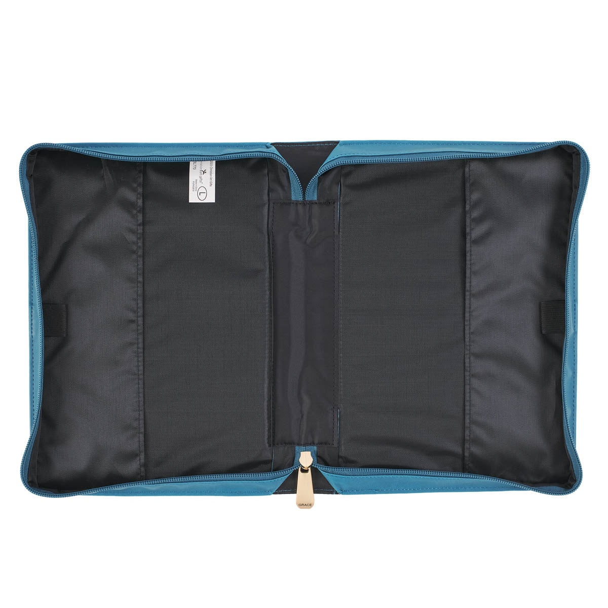 Keep all devotional supplies close at hand with the exterior slip pocket and interior pen loops. A gold-toned zipper pull keeps any loose papers or bookmarks inside the pages of your Bible and is engraved with the word GRACE. A Mediterranean blue lay-flat spine handle is attached to the Bible cover with gold-toned metal handle hardware.