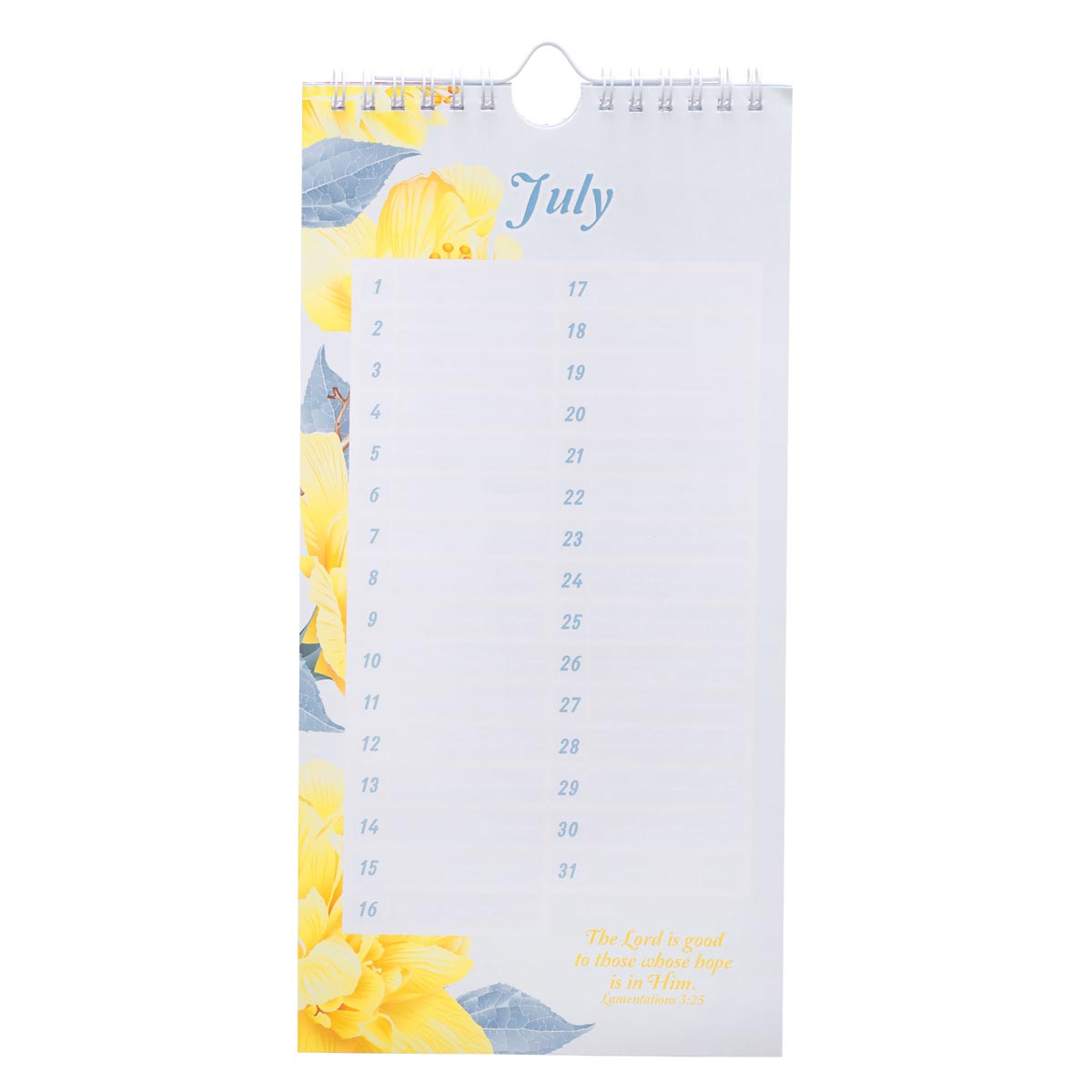 Keep track of a growing family's special days with this floral themed Special Days Calendar. The calendar runs from January through December. Each month has two spots per day to add special days like birthdays and anniversaries or any other day that is celebrated annually on the same day. Scripture verses can be found at the bottom of each page, along with beautiful floral images decorating the background. The Special Days Calendar is wire-bound and includes a tab for easy hanging. Scripture on the cover is taken from Isaiah 60:1