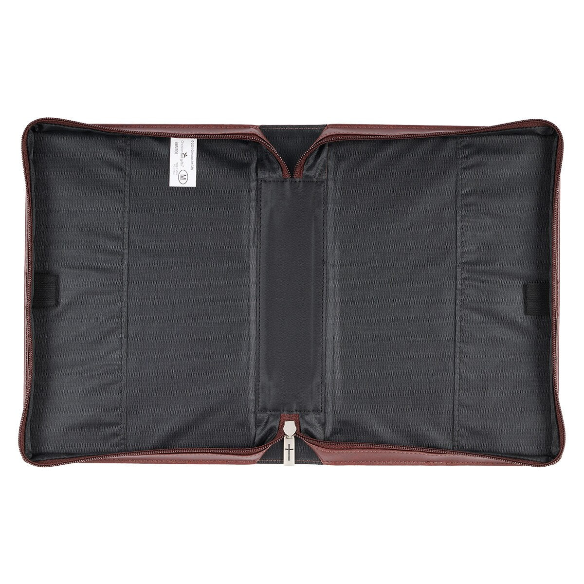An exterior zipper with a brushed silver cross-engraved zipper pull glides smoothly to close. The exterior slip pocket keeps loose notes, church bulletins, or even facial tissues safe. A convenient lay-flat spine handle in the same brown faux leather ensures that the Bible cover opens completely flat so that you have full access to your Bible. Inside the Bible cover are 2 pen loops to hold pens or highlighters. Topstitching along the edges of the Bible covers adds durability.