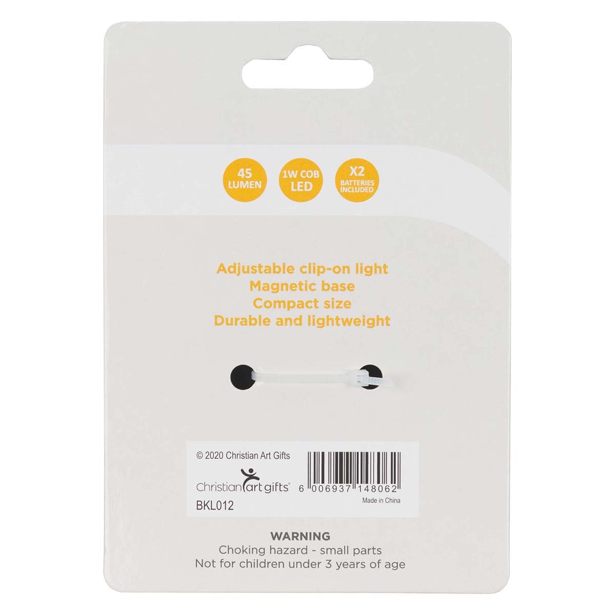 An adjustable pivoting light bar holds 8 LED chips bonded directly into a substrate to form a single module that generates 45 lumens of light with three settings—bright, dimmed, and strobe/pulse.The adjustable arm folds away to create a small, compact book light that can easily be slipped into a pocket, purse, or Bible case. A power switch on the top of the book light allows you to power it off before storage and adjust the light settings. Two 3V Lithium batteries are included for your convenience.