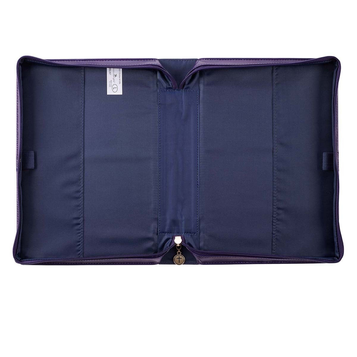 An attached purple faux leather lay-flat handle on the spine allows the Bible cover to open fully when in use. The brushed gold metal zipper pull is engraved with a cross design and compliments the cover's gold foiled lettering. The back panel features a slip pocket for notes and small notebooks. Inside the cover, two pen loops allow you to conveniently carry both a pen and a highlighter. This Bible cover is available in two sizes: medium and large. Please refer to the last image in the image carousel on the left for the Bible Cover Sizing Chart before selecting a size. The I Know the Plans Purple Floral Faux Leather Fashion Bible Cover makes a fantastic gift for any woman in your life. Consider giving it as a birthday, Christmas, or Mother's Day gift to your mom or gran, who loves bold floral designs. She will appreciate the protection it provides for her Bible as well as its bold beauty.- Purple Faux Leather