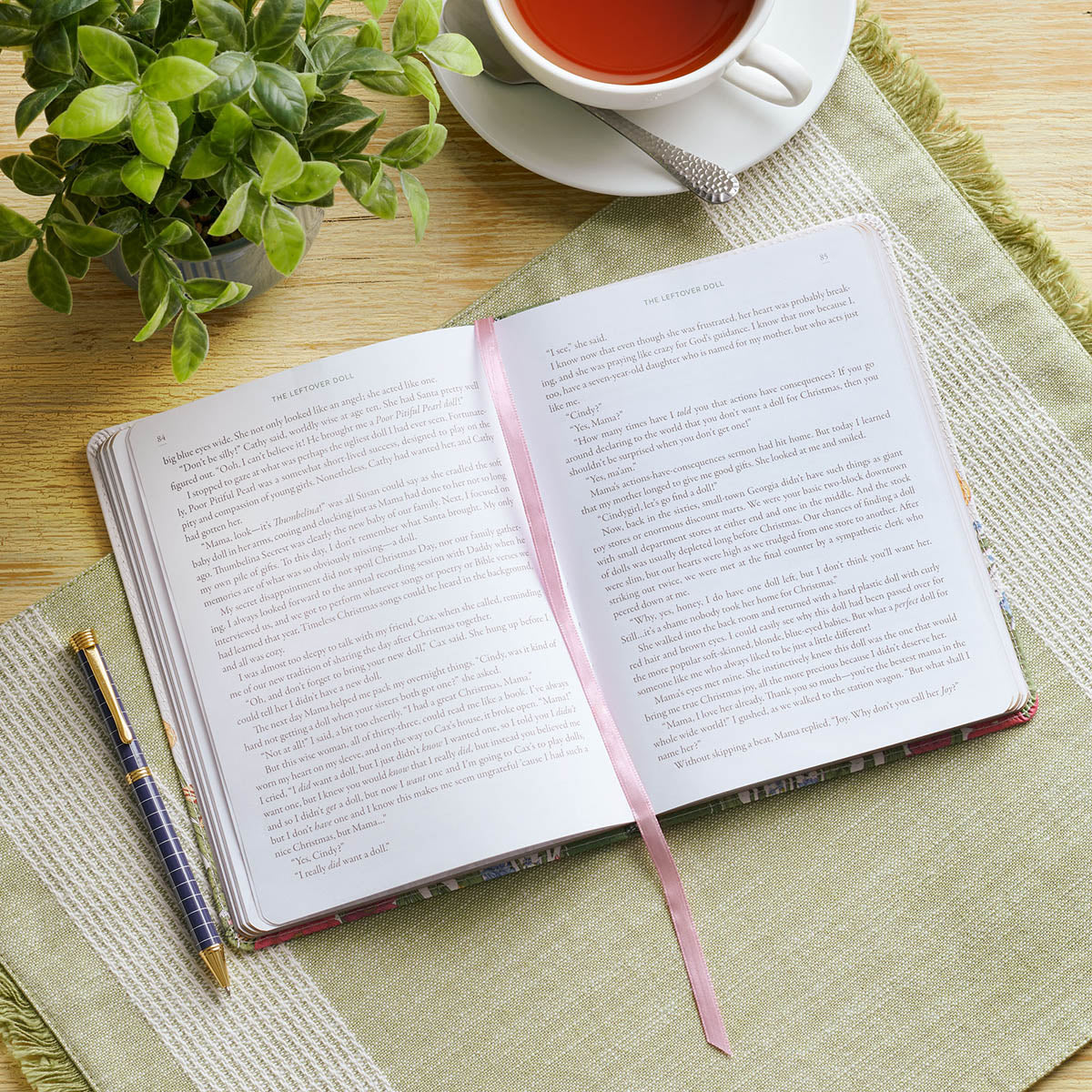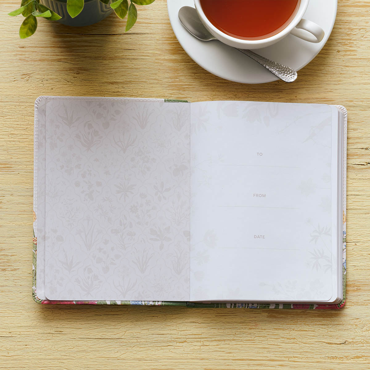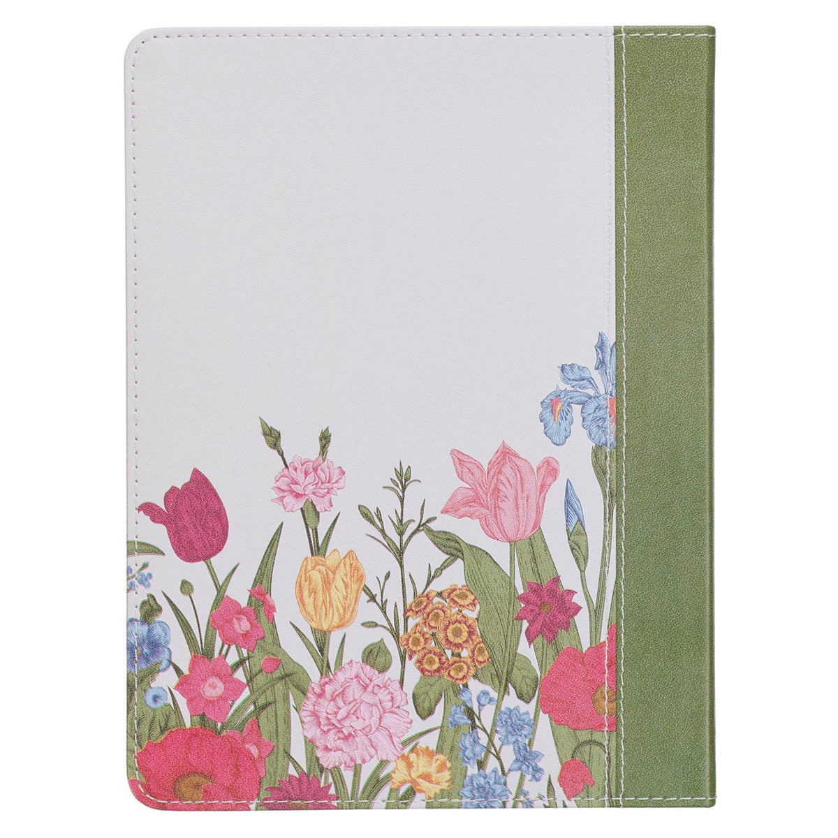 The two-tone, faux leather cover combines olive green and creamy white for a spring-themed design. A garden of tulips, carnations, and daffodils blooms on the front of the book where the title appears in gold-foiled letters. Matching gold is used on the gilt-edged pages, and a pink ribbon marker matches the lovely flowers.