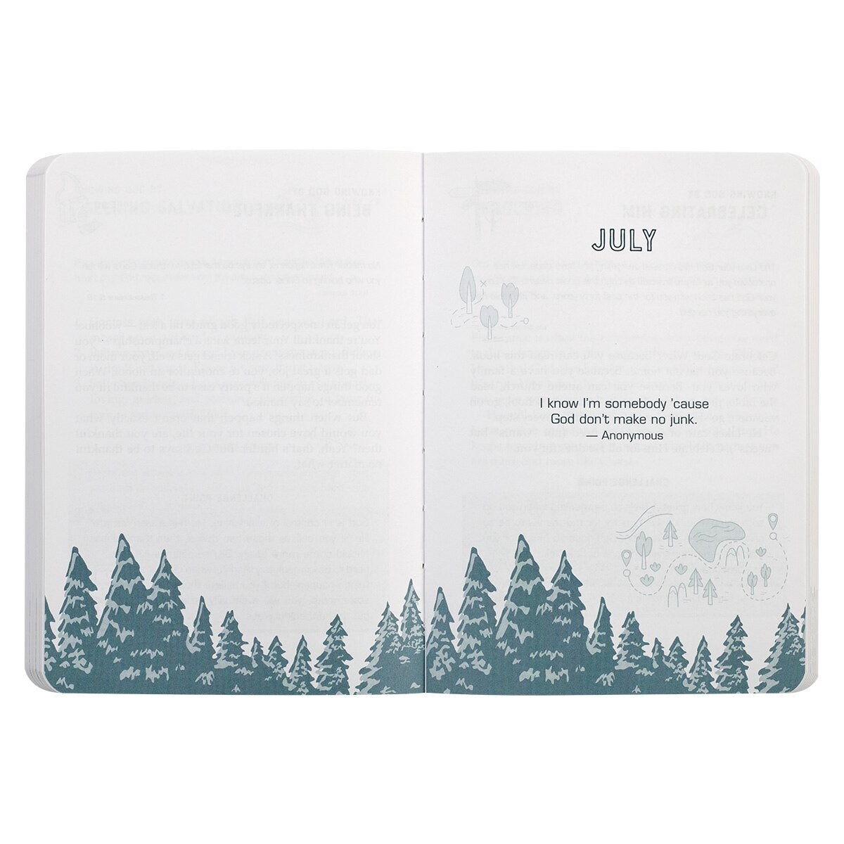 The Knowing God For Boys Devotional Paperback Edition is the perfect devotional for busy boys who can't sit still very long. The short devotions and practical life lessons will percolate in their minds and souls as they take on the challenges of skateboarding, bicycle riding, or any other adventure on their schedule.The softcover is decorated with a fun nature design that features a pine forest with a mountain in the foreground and a mountaintop in the background. The title and subtitle are displayed in a blue frame with a white border and a red banner.