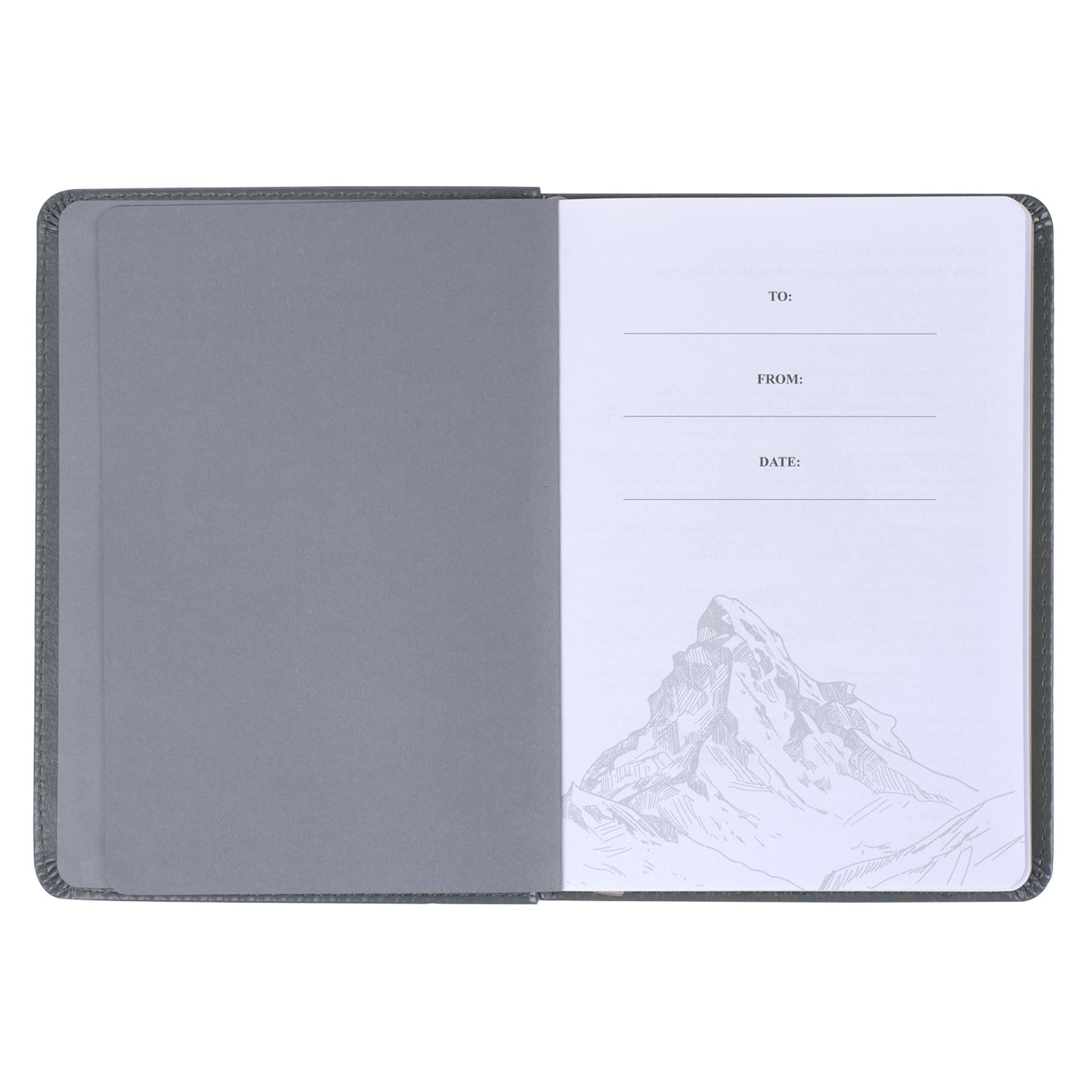 The devotional book's gray faux leather cover is adorned with a heat-debossed border that frames a heat-debossed mountain with a gold-foiled map leading to the peak. The map's gold-foiled trail complements the gold-foiled title.