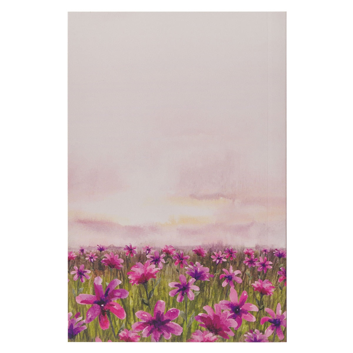 La portada está hecha de cartulina gruesa y resistente y está adornada con un campo de flores de color rosa vibrante que se mece contra el fondo de un cielo rosado brumoso al atardecer. El título se coloca dentro de un marco morado, embellecido con un toque de rosa metálico que le agrega un brillo sutil.