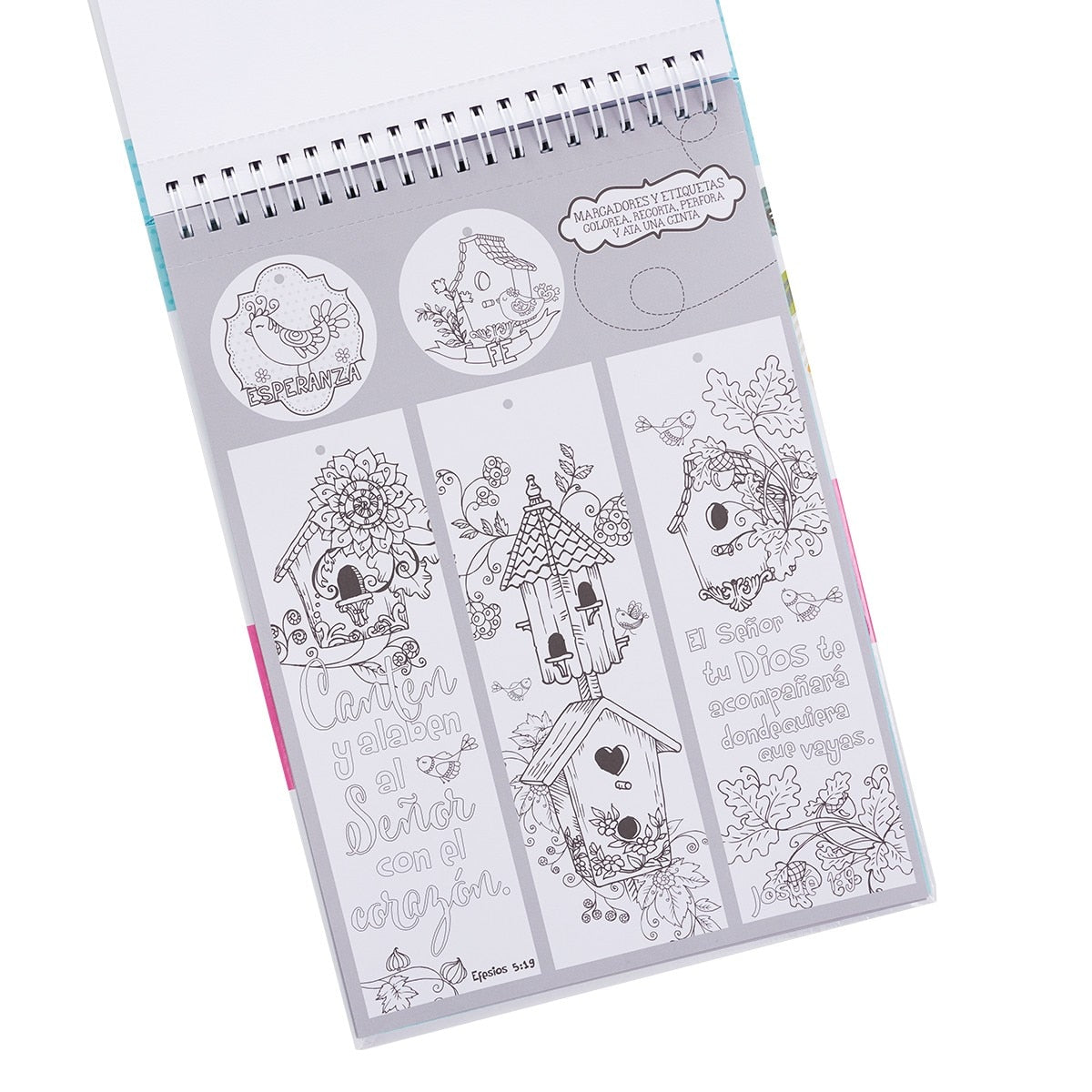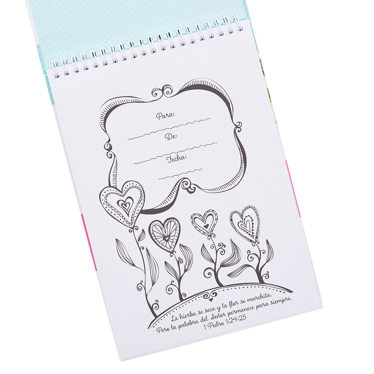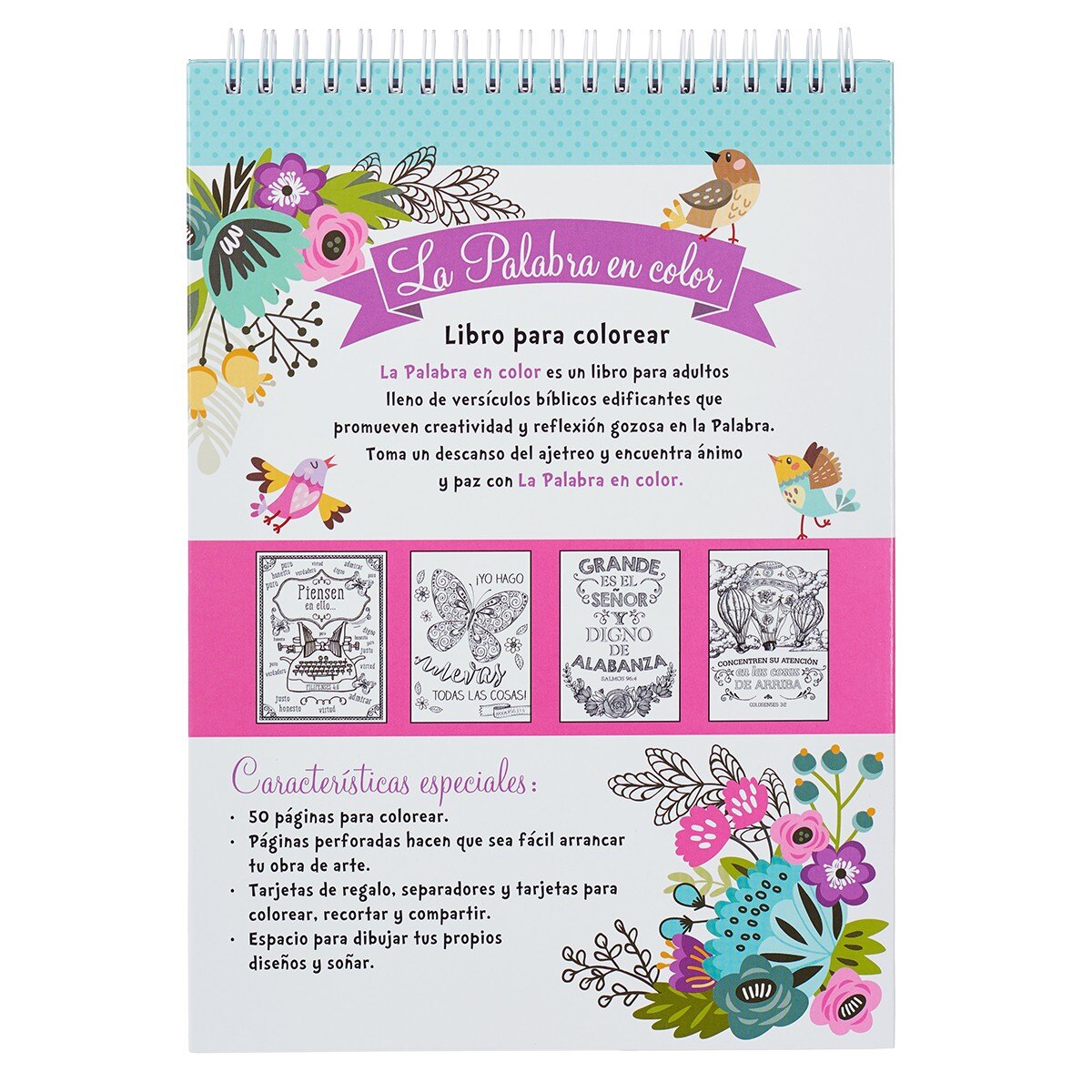 El libro para colorear tiene una espiral de alambre de 5/8 de pulgada en la parte superior, la cual facilita voltear las páginas. La tapa dura también sirve como una superficie para colorear donde sea que te encuentres – en una sala de espera, en el consultorio médico o en la casa. El libro está encuadernado en cartulina de alta resistencia. Contiene 104 páginas perforadas impresas en un solo lado para poder arrancar o descartar fácilmente. En total, hay 50 imágenes para colorear, algunas de las cuales incluyen etiquetas de regalo, separadores y tarjetas. Con la variedad de diseños, ¡será difícil decidir cuál colorear primero! Colorea los dibujos, recórtalos, úsalos en tu álbum de recortes, como etiquetas para regalos, como regalos para tus amigos, o plastifícalos y úsalos como separadores.Comparte la diversión e invita a otros para colorear contigo los diseños del libro para colorear La Palabra en color – las páginas perforadas hacen que sea un pasatiempo para compartir. Cuando termines, cuelga tus obras de arte en la pared para conservar la inspiración.- Inspirador Libro de Colorear para Adultos