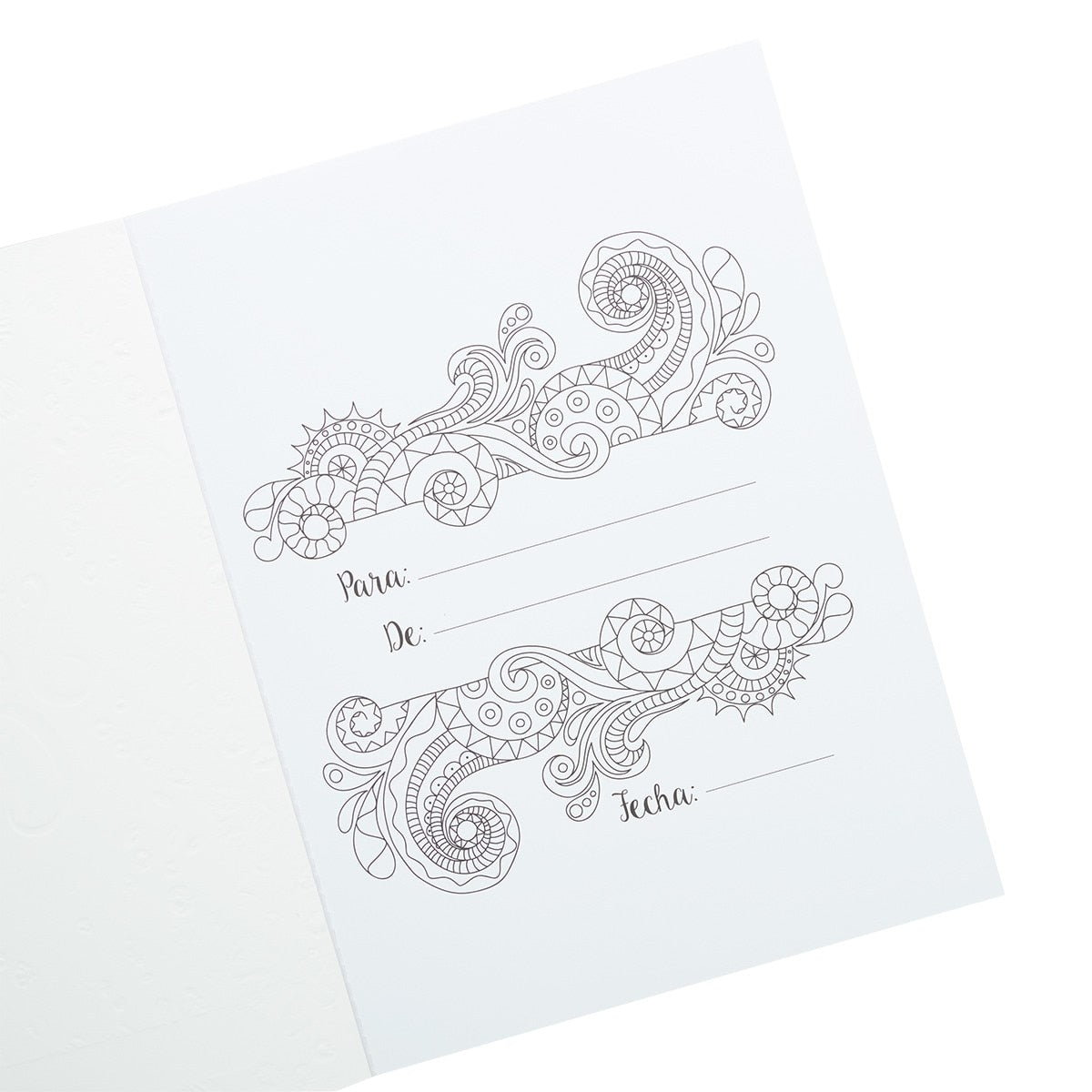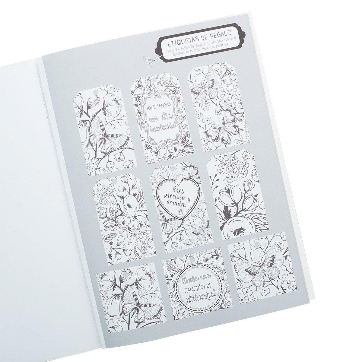 El libro está encuadernado en papel de alta resistencia y cuenta con 128 páginas perforadas con 62 imágenes para colorear. Al menos 7 páginas incluyen tarjetas más pequeñas, marcadores y etiquetas de regalo que puedes colorear, recortar y regalar.