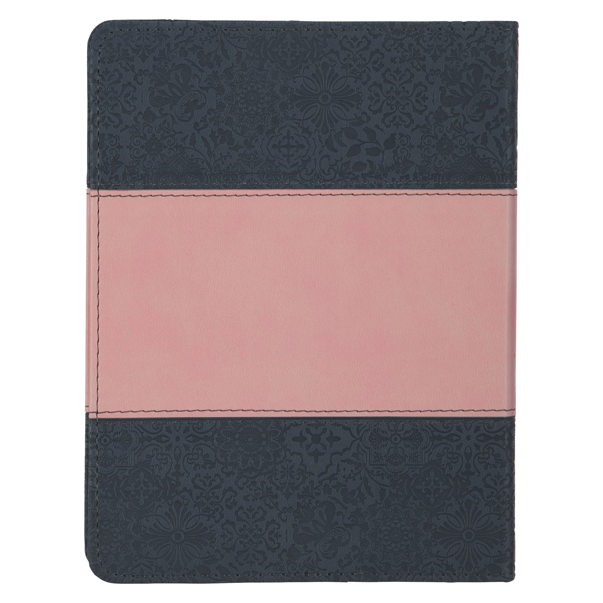 The gray faux leather cover features an exquisite heat-debossed floral patchwork motif. Accentuating the book's center, a ballet pink faux leather band wraps around both covers and the spine and is held in place by a double row of topstitching. The title and subtitle are beautifully heat-debossed and accented with shimmering rose gold foil.