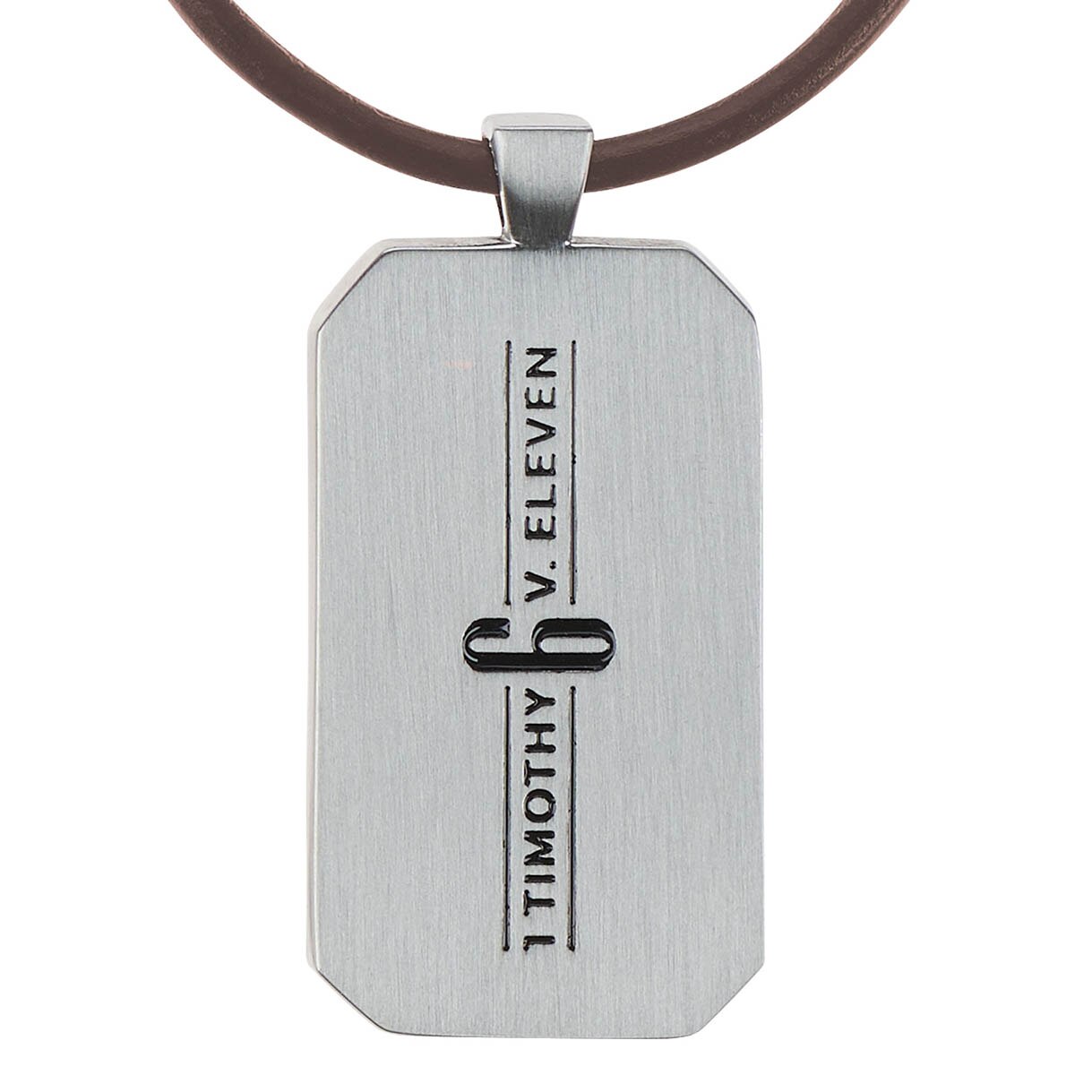 The metal pendant has a rectangular shape, beveled corners, and a brushed silver finish. The front is stamped with a minimalist cross design that is filled with black epoxy. The reverse side carries the verse reference, also filled with black epoxy.