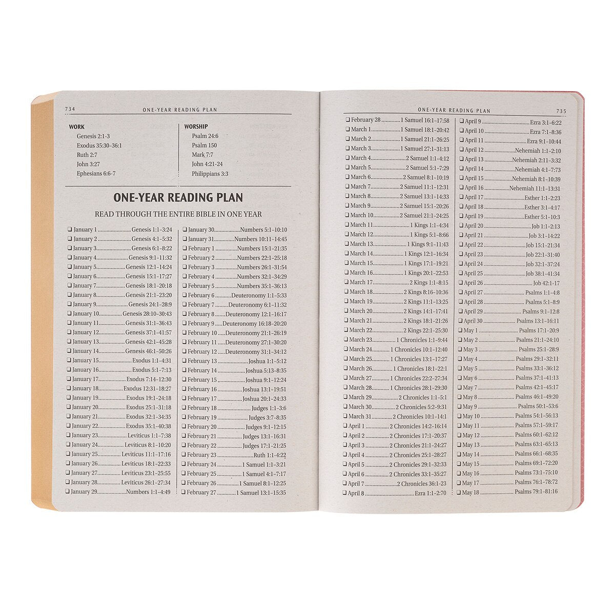 The Bible is written in the complete 1769 revision of the 1611 King James Version, known for its poetic language and enduring impact. Readers will appreciate the easy-to-read double-column layout, while the included Scripture verse finder and one-year reading plan make this Bible a tool for encouragement and discipleship. A lay-flat spine and a presentation page provide a finishing touch for gifting moments.