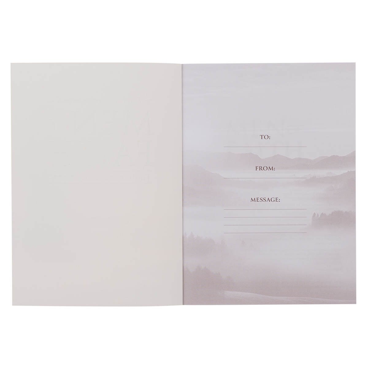 The matte softcover binding features a misty mountain landscape bathed in golden morning light. Its calm tones and embossed lettering make it a timeless gift for dads, husbands, mentors, or any man desiring a deeper prayer life. Inside, a printed presentation page allows you to personalize your gift with a name and a note of encouragement.