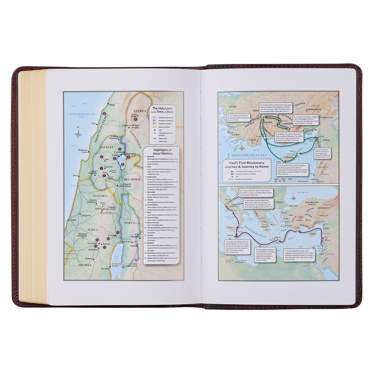 For the most comfortable reading experience, this Bible opens flat and the 7-point text is printed in a double-column format with reader-friendly subheadings on each page. A thematic Scripture verse finder, 8 full-color maps, and a one-year reading plan further enhance the usability of this Bible. As with all our Compact Bibles, the words of Christ are printed in red ink.