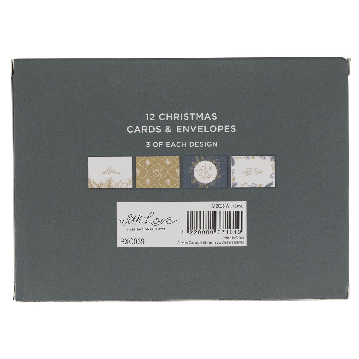 The cards are paired with white envelopes with a small golden pine branch on the front. The set is packaged in a charcoal gray gift box with a die-cut window displaying the first card. The set includes 12 cards, 3 each of 4 designs, and 12 envelopes. All the cards are blank on the inside, so you can add your own message.