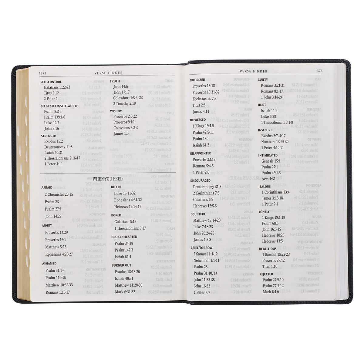 This Bible includes all the essentials you need from a luxury Bible and includes a presentation page at the front, thumb indexing, gilt-edged pages, and a satin ribbon marker. A lay-flat binding lets the Bible open flat on a table without damage to the spine.