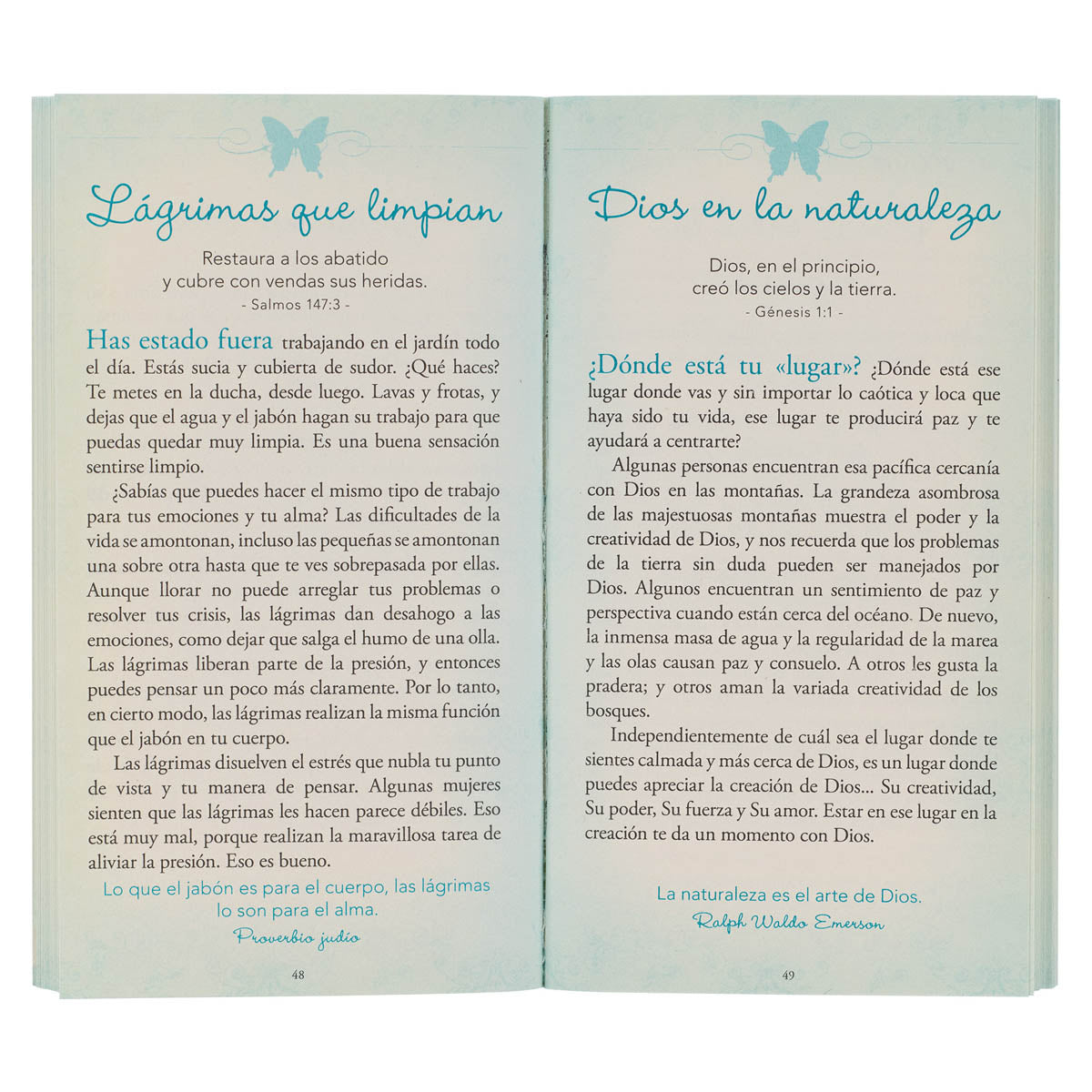 El tamaño portátil de este pequeño libro de regalo devocional te permite deslizarlo en el bolsillo de un abrigo o en un bolso, listo para ser leído y para reconectarte con Dios siempre que te sientas movida a hacerlo.