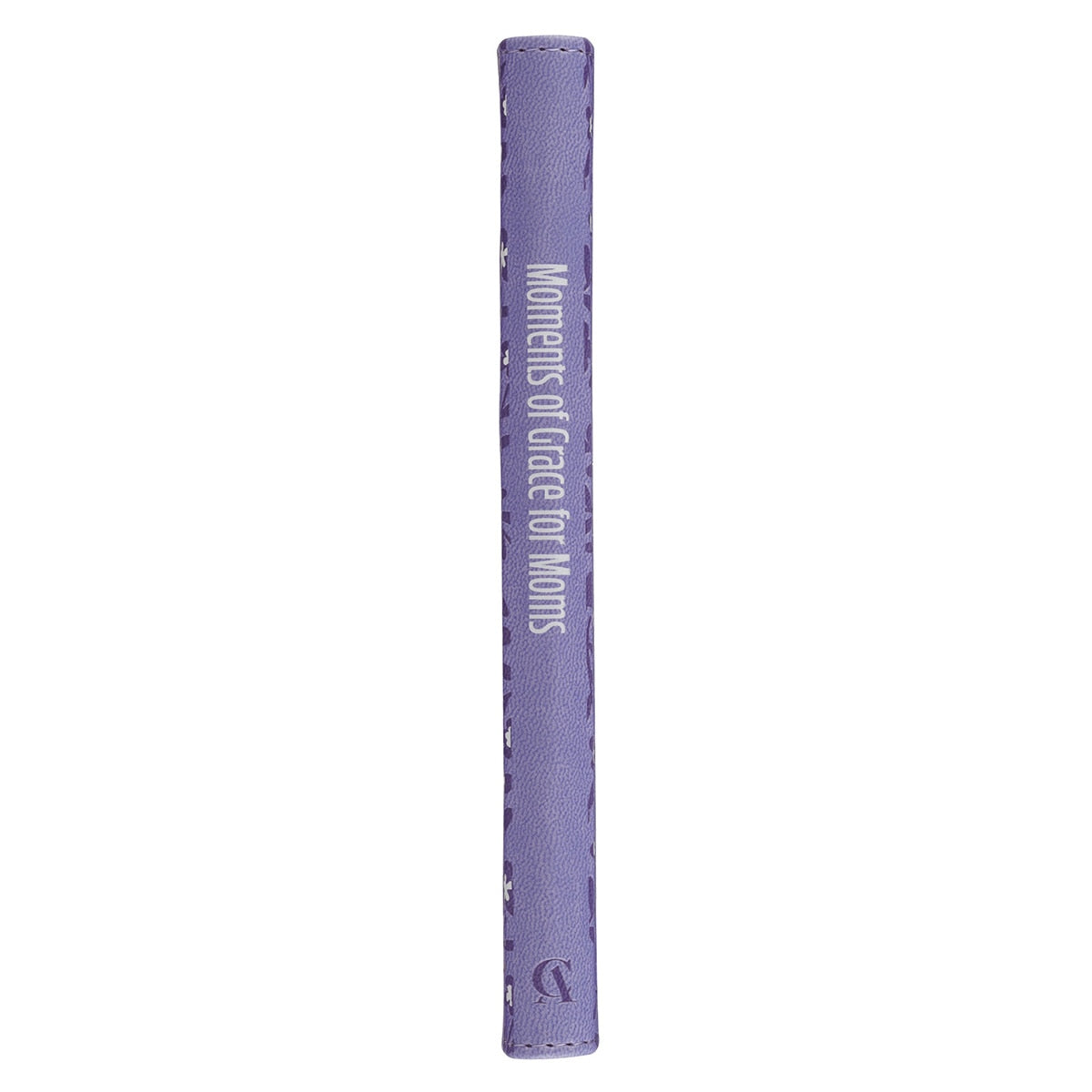The periwinkle purple faux leather cover of Moments of Grace for Moms has a charming floral design. Heat-debossed daisies and foliage fill the background of the cover, and the title rests in front, held in a beveled frame. A white ribbon marker brings out the white of the flowers and title.