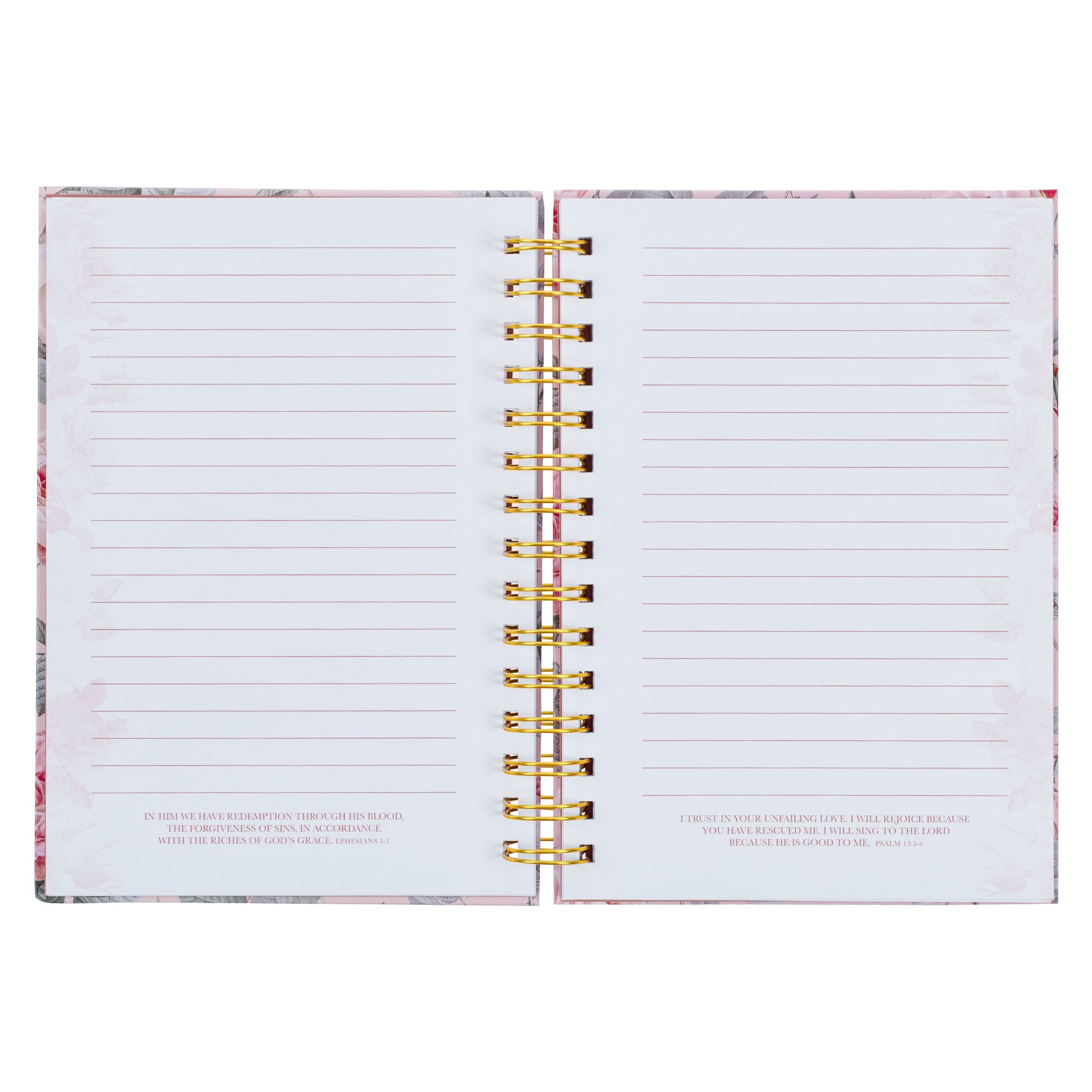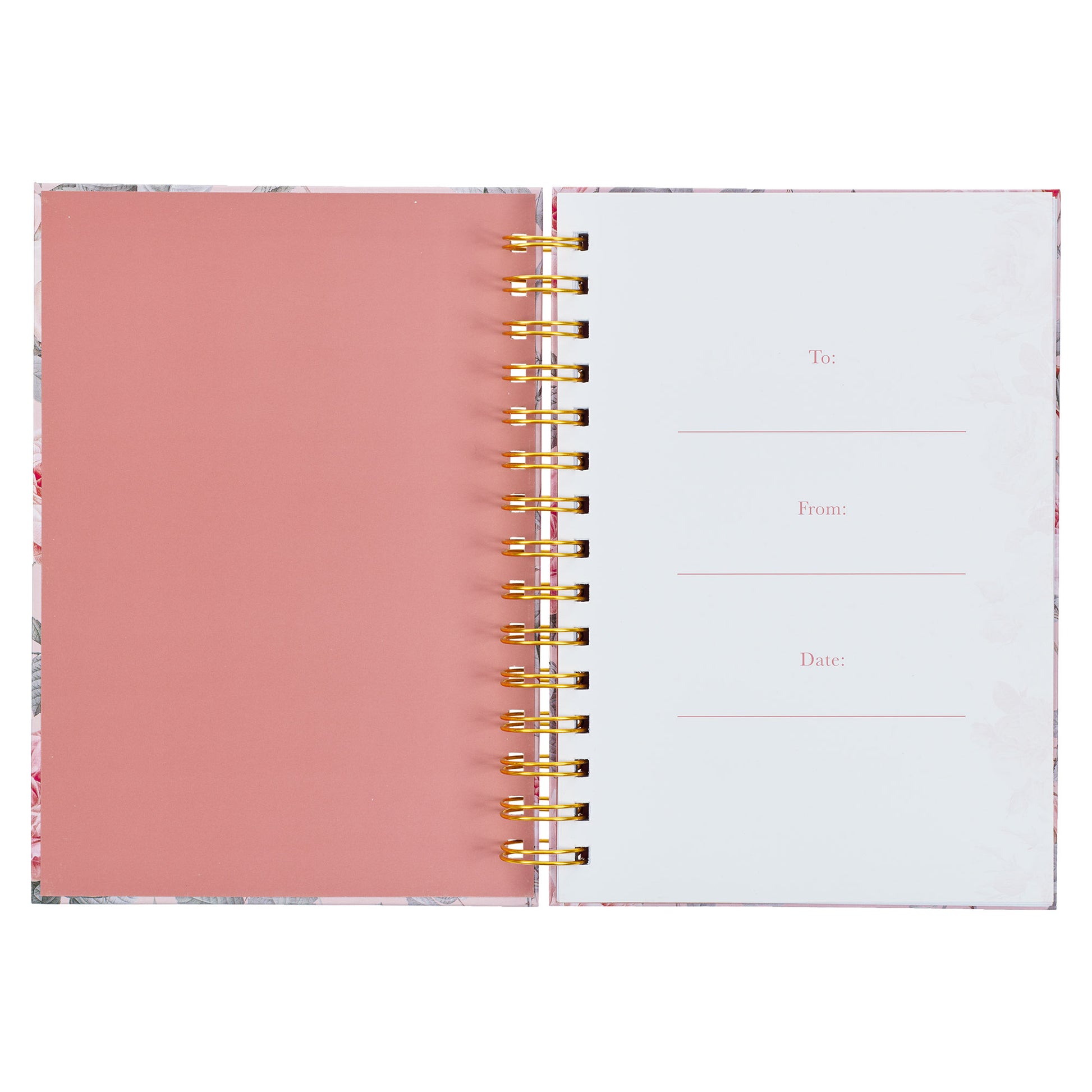 Pretty pink flowers bloom against a pink background on the covers of the wirebound journal. In the center of the cover, a white frame edged in gray holds the gold-foiled sentiment.