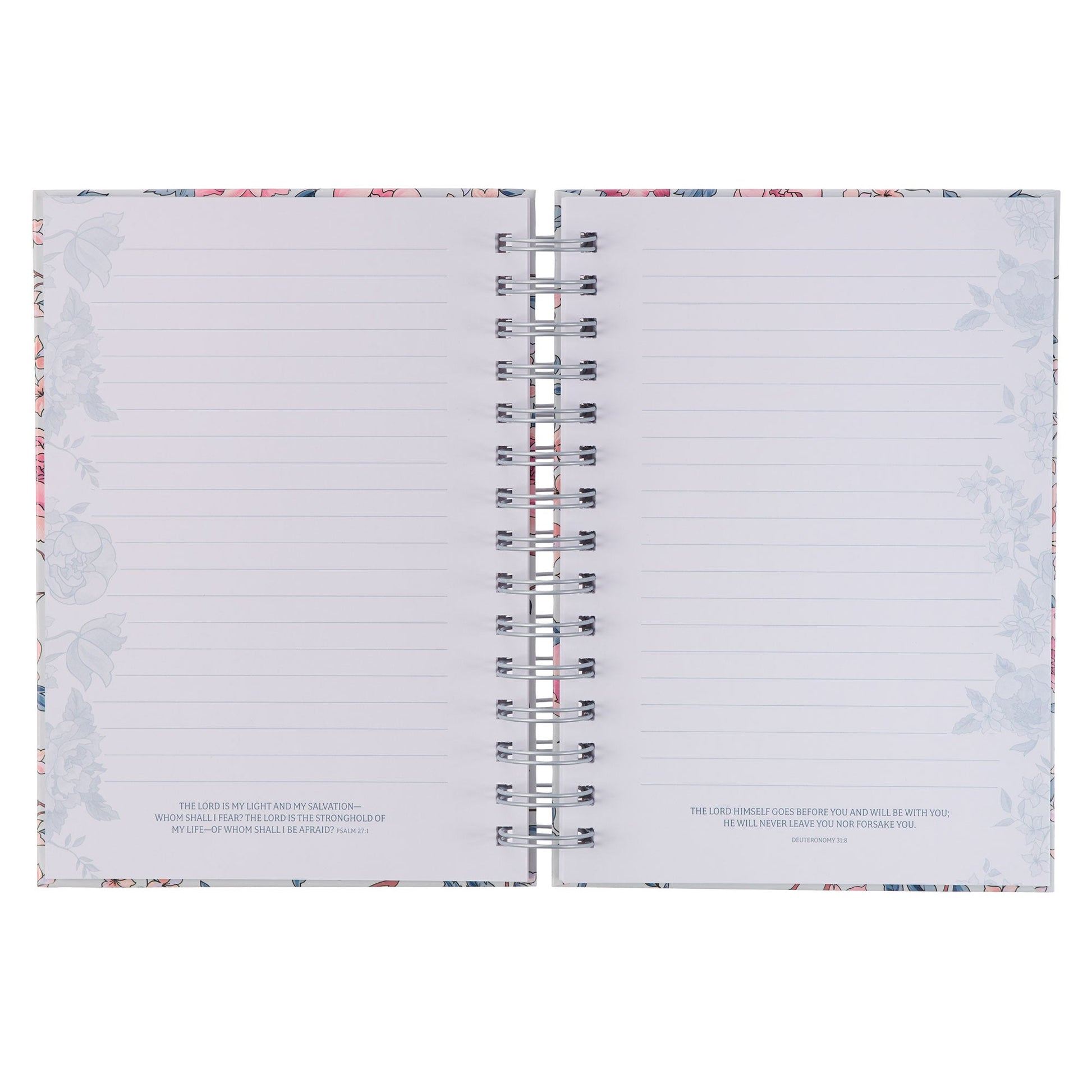 Double-coiled silver wire binding is used to bind the 192-page journal. The creamy white interior pages are lined, and each page features a carefully selected Bible verse that can be used as a journal or prayer prompt. The hardcovers and sturdy wirebound binding make it easy to use the covers as a hard surface to write on.