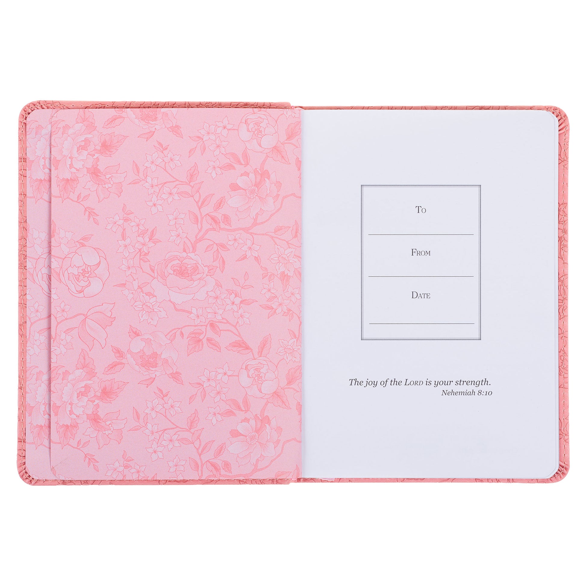 Shimmering silver gilt-edging is applied to the page edges to embellish and protect. A presentation page in the front of the journal can be personalized, and each of the lined 240 pages features a Scripture verse for reflection. A pink satin ribbon marker is attached to the spine so you can keep track of your entries.