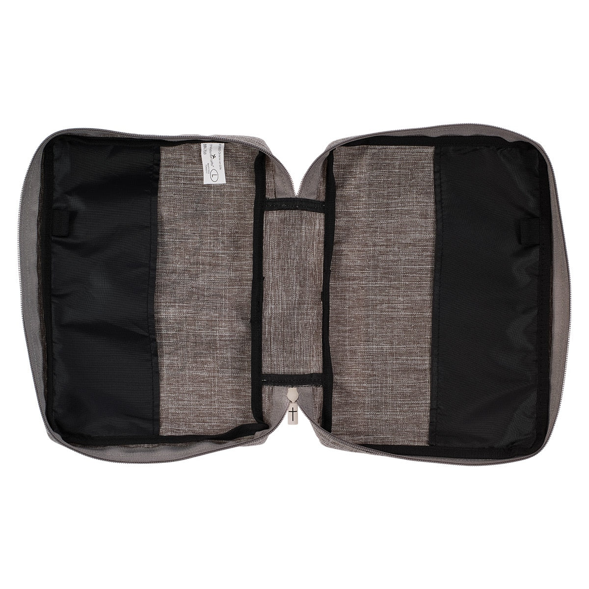 The durable, water-resistant poly-canvas used in constructing the gray Bible case can endure a lot of handling. The front cover is screen printed in black with Scripture taken from the Psalms.