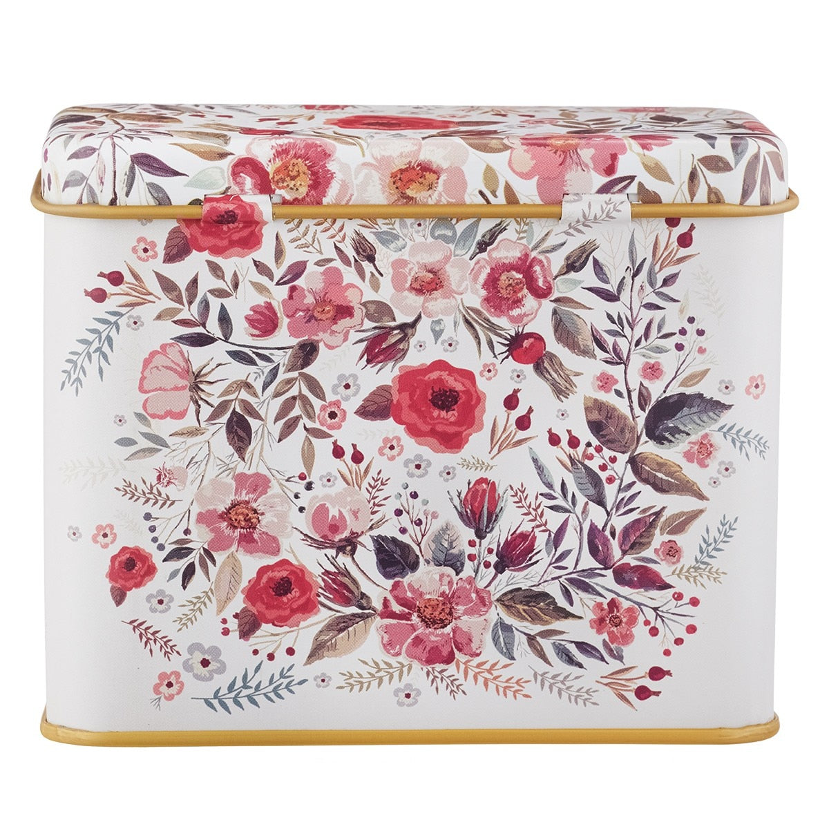 The durable matte tin features a powdery blush pink background printed with a purple and pink watercolor floral pattern. It has a brass interior and edging around the lid and base, and a brass label holder displays a removable label in a beautiful scripted print.