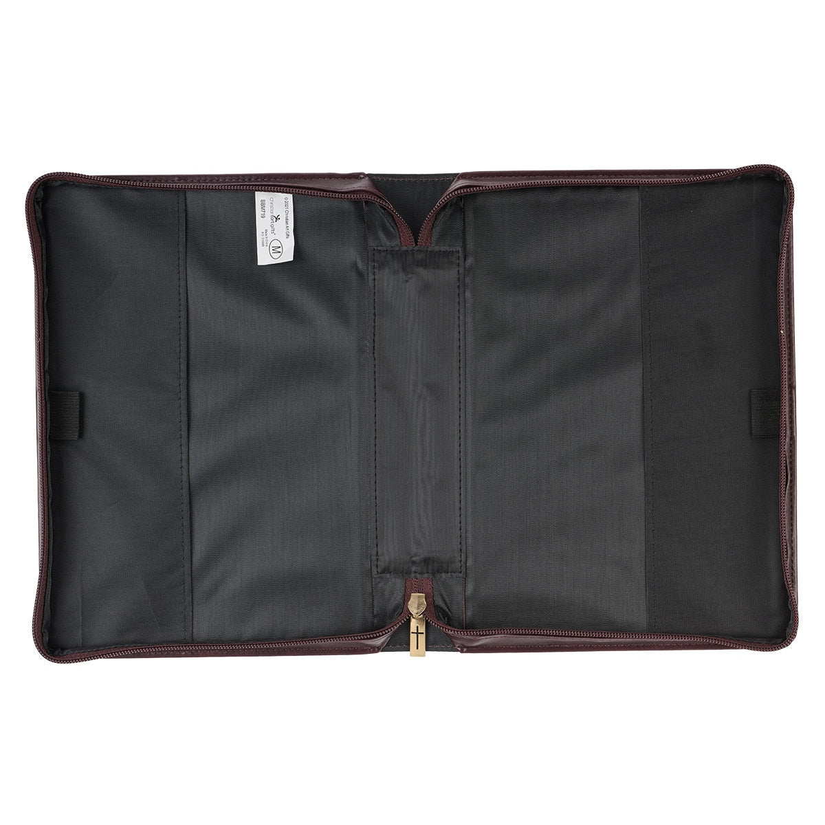 A helpful burgundy faux leather lay-flat handle is attached to the spine of this faux leather Bible cover with gold metal hardware that matches the cross engraved gold metal zipper pull. Along the back sits a slip pocket with a topstitched edge, for placing sermon notes or verse cards and two pen loops rest in the interior to keep your supplies close. A rose is heat-debossed in the lower right-hand corner of the back slip pocket.