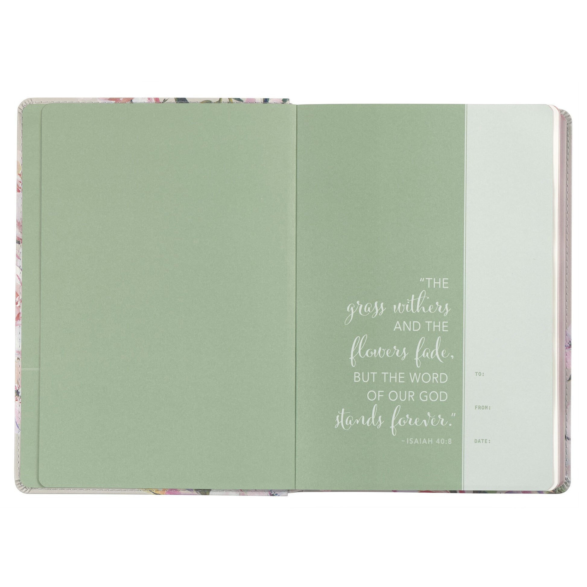 The devotional Bible features a light gray pearlized cover screen-printed with an enchanting pink floral watercolor design that encircles the pink-foiled title.