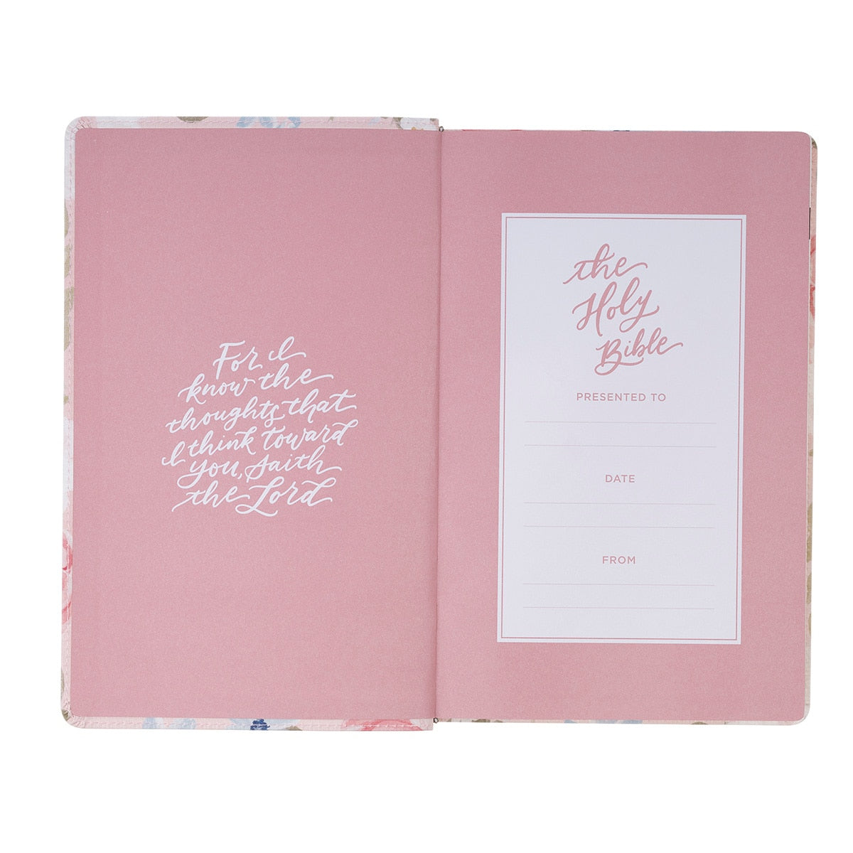 The flexcover Bible's cover features the artwork of artist Allison Loveall. Blooms with soft pink and white roses, accented by delicate blue forget-me-nots and lush green leaves, are set against a subtle blush background. At the heart of the design, a hand-lettered verse in shimmering rose gold foil starts on the front cover and continues on the back.