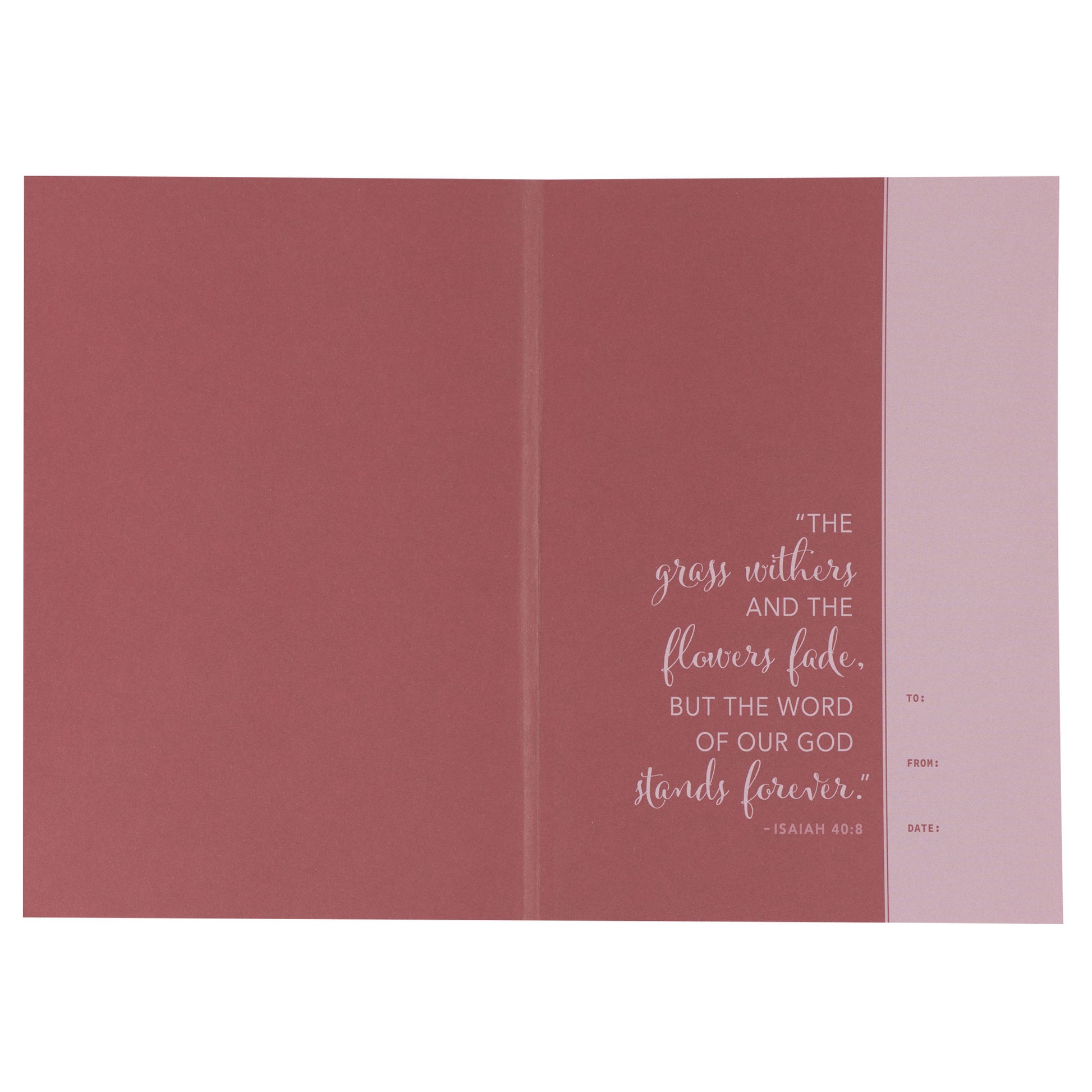 The front cover of this softcover Bible showcases oversized lilies shaded in various hues of pink, ranging from light to dark. This beautiful scene is complemented by a contrasting navy blue spine. The sentiment is presented in an elegant gray embossed multi-font design in the center of the front cover, with the version reference right below it.