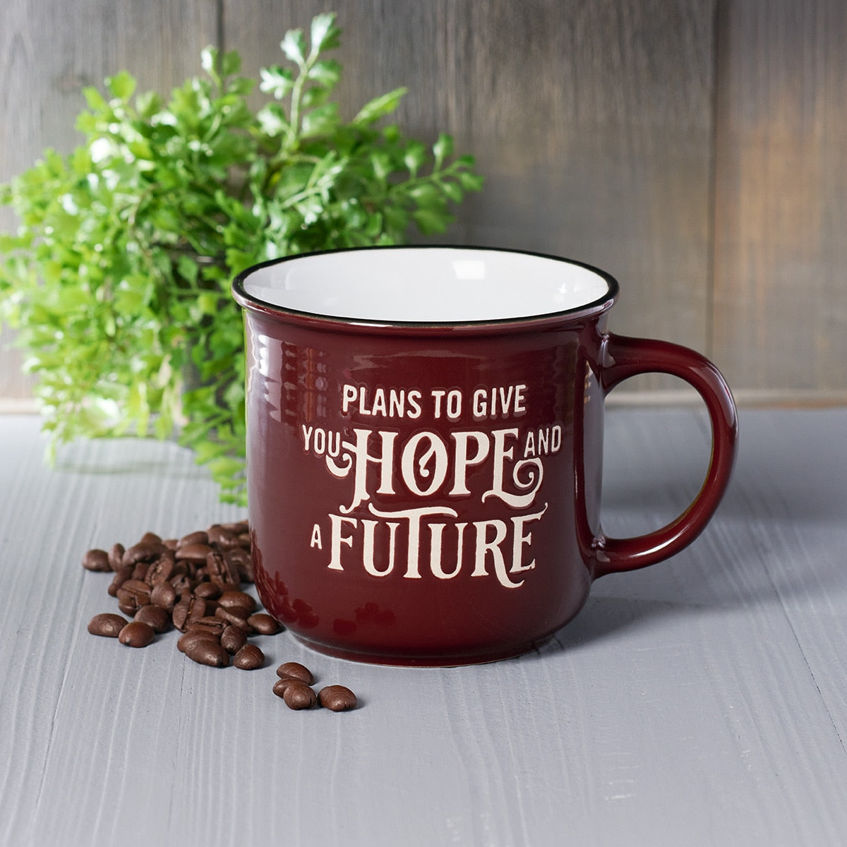 The Plans for Hope and a Future Burgundy Ceramic Camp-style Mug is the perfect color to complement a warm cup of coffee or tea, and the message it carries is the perfect encouragement to go out and do what God has called you to do.