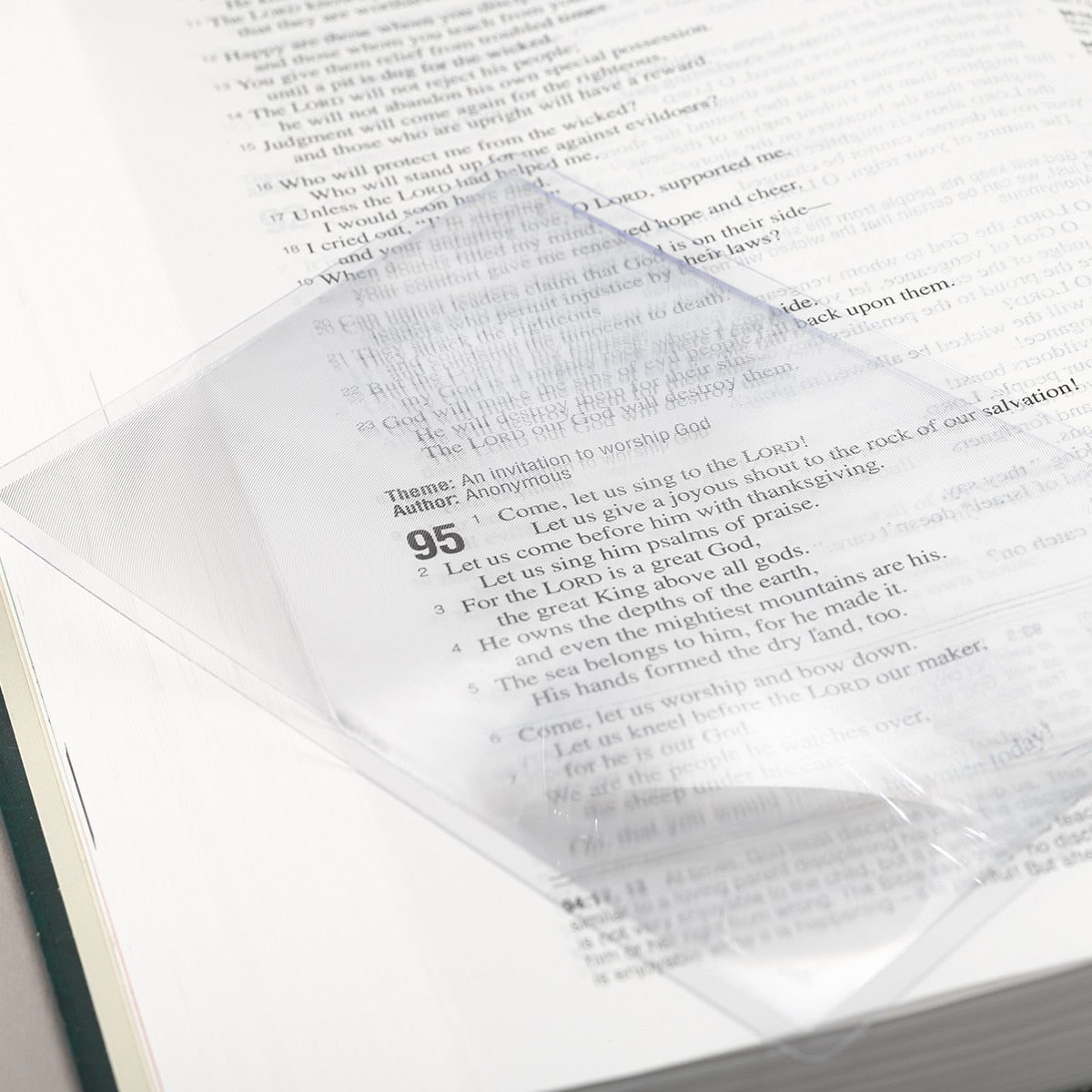 Our thin and flexible pocket-size magnifying sheets can be slipped into a handbag, coat pocket, or book, ready to use when you need to. Simply hold the pocket-sized magnifying sheet about 4 inches above a page to magnify.