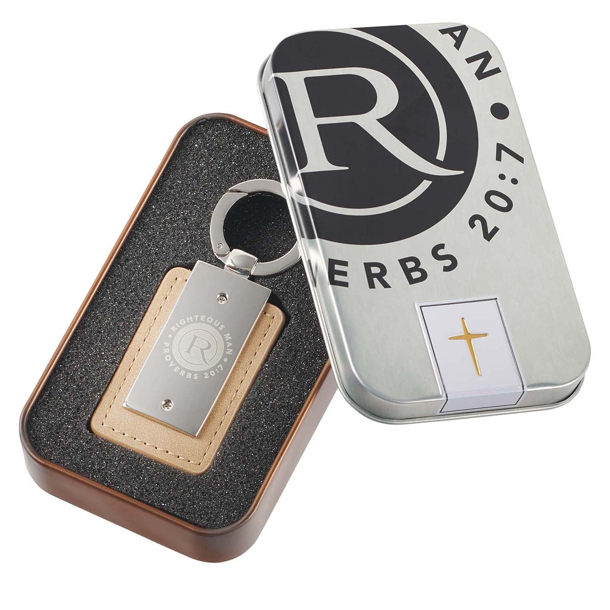 Righteous Man Silver and Tan Key Ring in Gift Tin - Proverbs 20:7