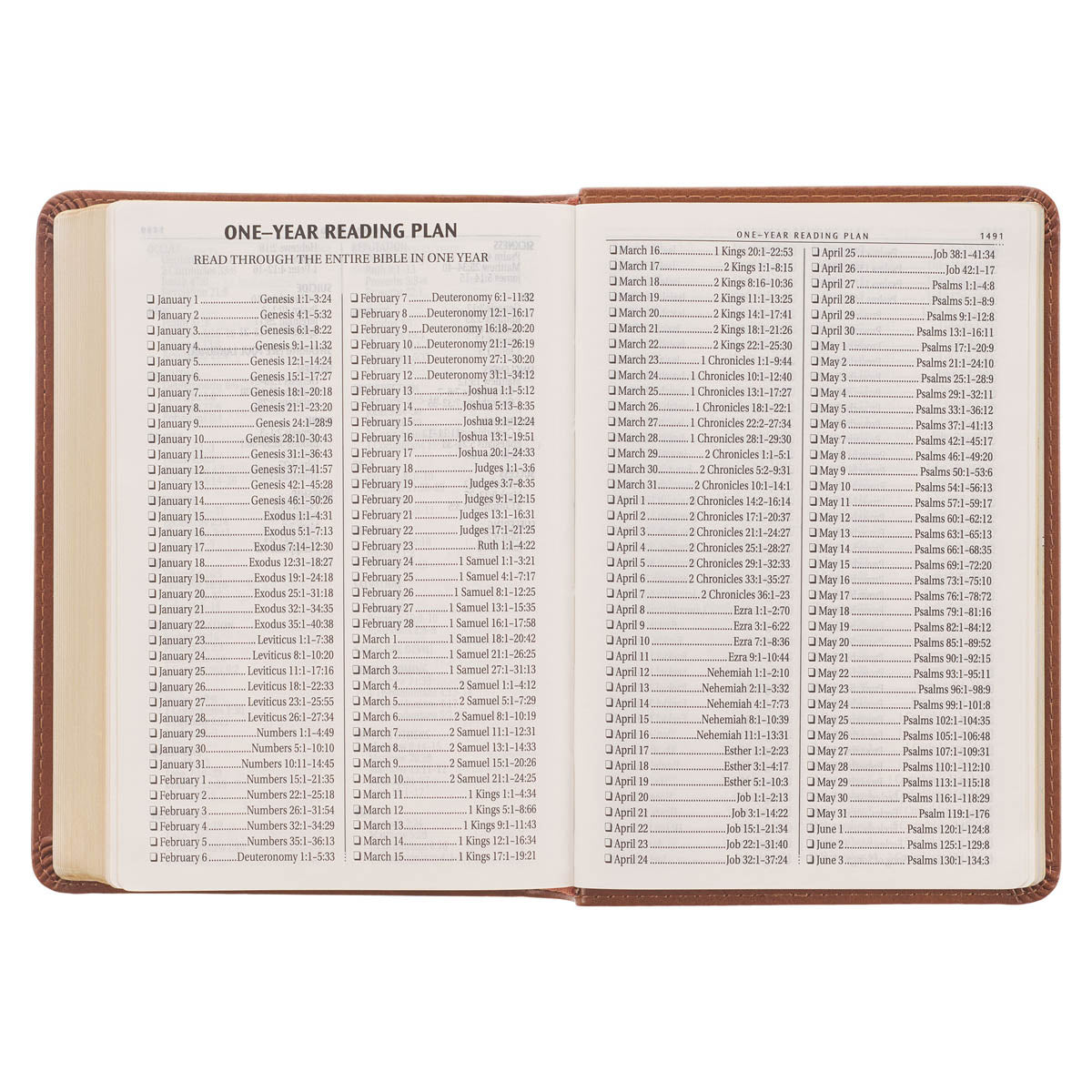 The Saddle Tan Faux Leather Large Print Compact King James Version Bible combines easy in-hand portability with easy-to-read text. Although the Bible itself is much smaller, the 10 pt. text is slightly larger than the text found in a standard size Bible (8 pt).