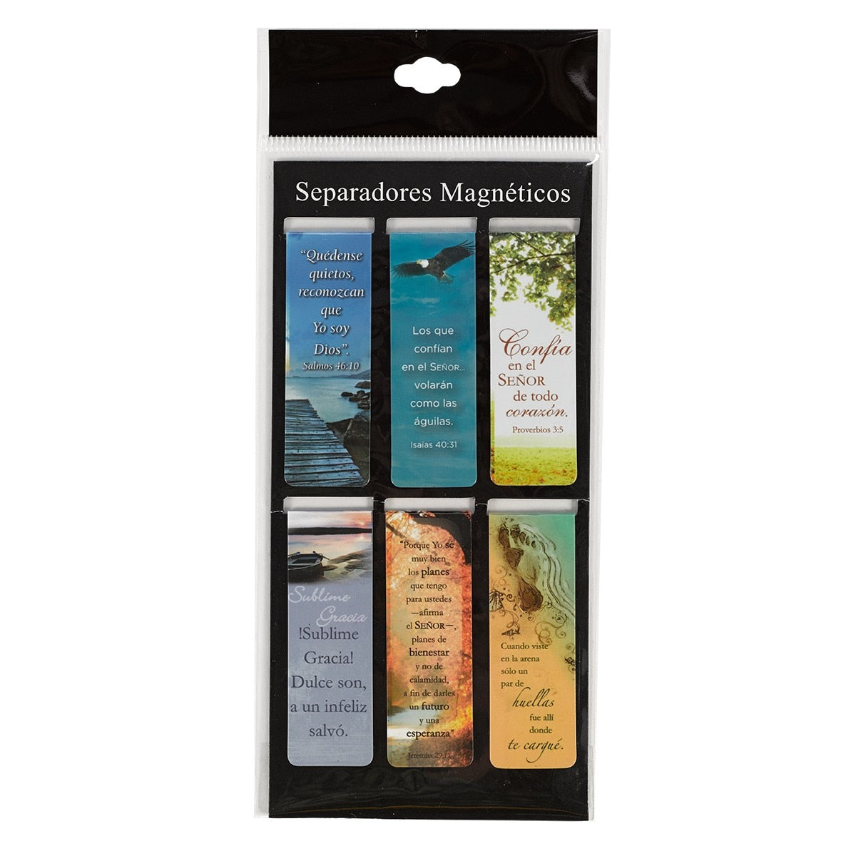 Marque su página con estilo con esta colección de seis separadores magnéticos clásicos. El diseño es una mezcla de arte, versículos de la Biblia y frases inspiradoras. Cada cartón tiene seis motivos diferentes que hacen juego y en cada paquete hay tres cartones. Ideales para compartir con amigos, regalar en la clase de estudio Bíblico, para poner uno en cada libro, etc. Económicos, prácticos y muy atractivos.