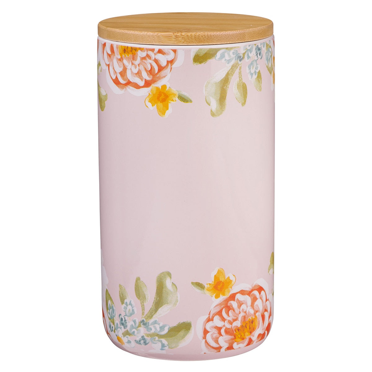 Bands of happy blooms surround the base and rim of the pink ceramic gratitude jar. The sentiment is placed between the two floral bands in gold-foiled letters.