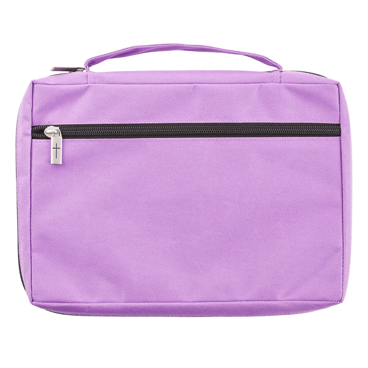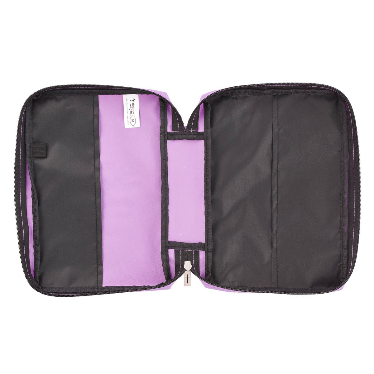 The poly-canvas material of this Bible cover makes it easy to clean and durable, withstanding daily wear and tear. Inside pockets and a pen loop allow for easy note-taking. The lay-flat spine handle also allows for easy reading.