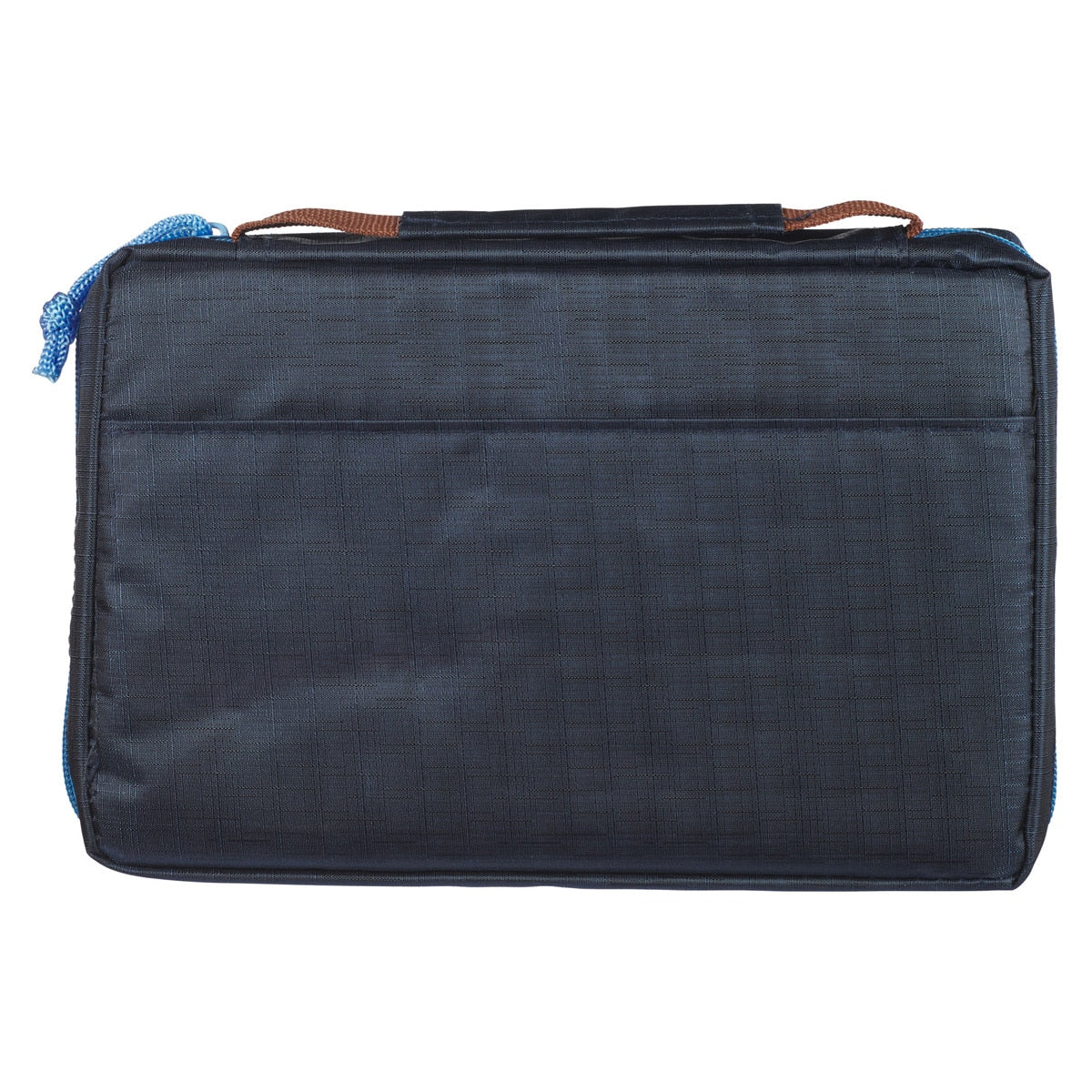 Brown binding sandwiches a bright blue zippered pocket on the front of the Bible cover. Knotted blue cords act as zipper pulls for the pocket and the blue zipper that closes the cover. On the spine, a lay-flat handle folds away to let the Bible pages open all the way. Polyester is the perfect fabric for boys; it's lightweight, durable, and water-resistant and holds up to any adventure!